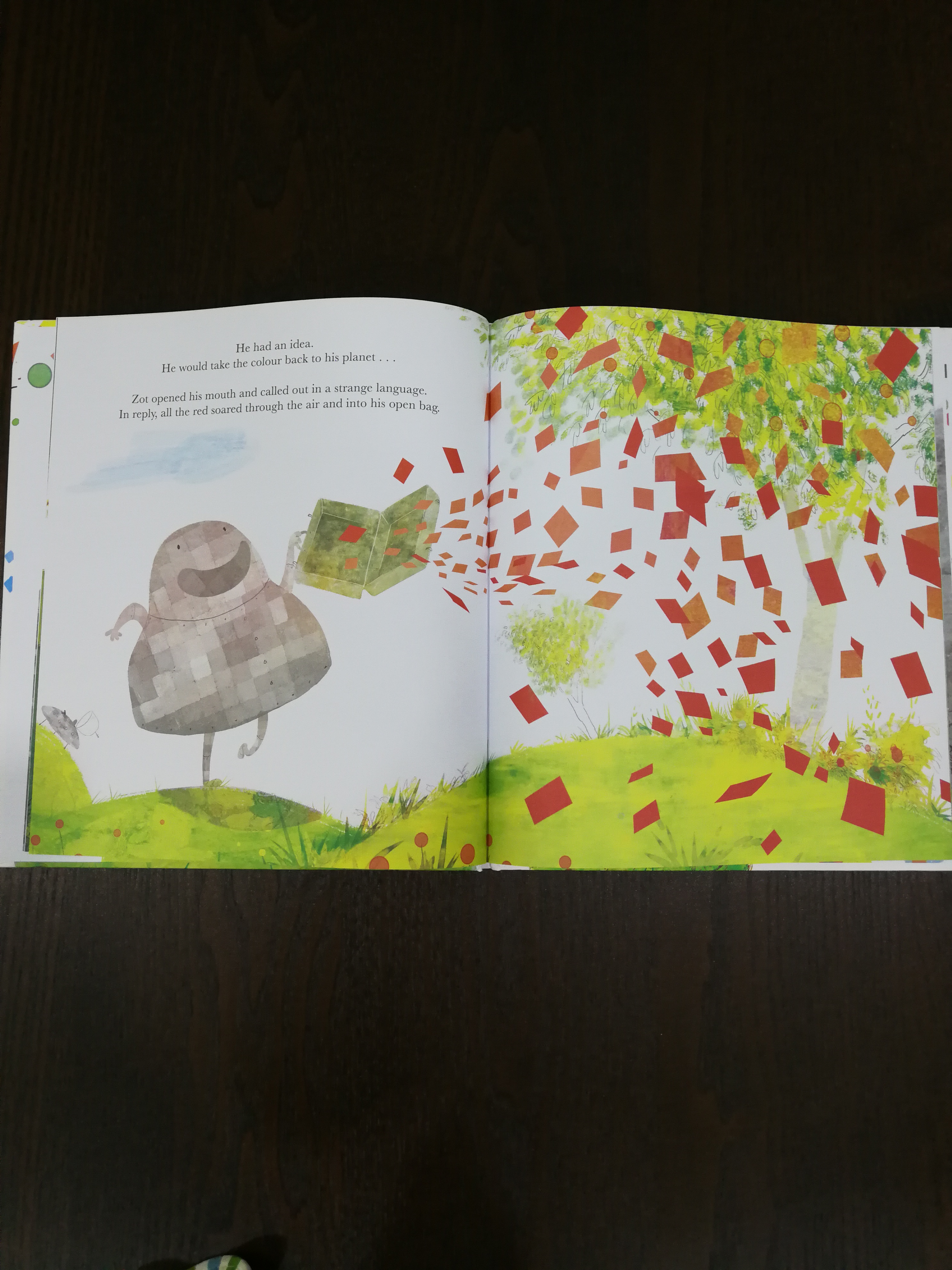 Zot来自一个没有颜色的灰色星球。为了寻找幸福,他独自乘着太空船到一个他渴望已久的彩色星球。Zot决定把所有的颜色都偷回自己的家,包括一名小男孩的橘色气球。在很多EQ幼儿书的世界里,Zot就是个彻头彻尾的坏人。然而在《The Colour Thief》的世界里,Zot是一只迷失的小羊。他本可以留在彩色星球,但他不愿意遗弃自己的同伴,以为把颜色都带回家跟同伴分享就会很快乐。然而,他最终也不忍心伤害小男孩,百般不情愿下,还是把所有的颜色归还给小男孩的星球。小男孩在Zok准备两手空空回家时,把手上的气球送给他。Zok把气球抱在胸前,感受到真正的快乐。他把小男孩的心意带回灰色星球,虽然只有一个橘色气球,但已经让灰色星球上的所有居民感受到温暖。