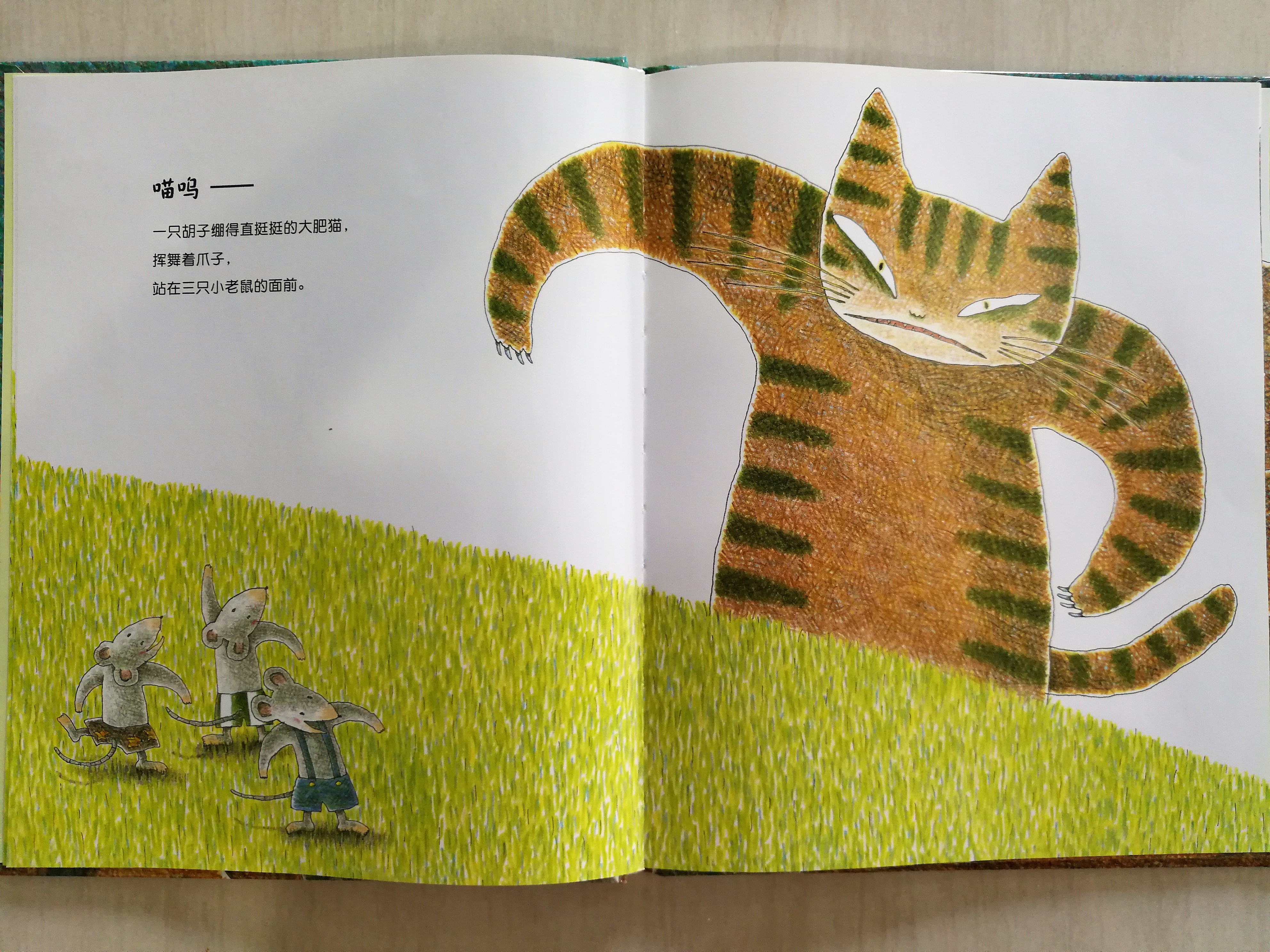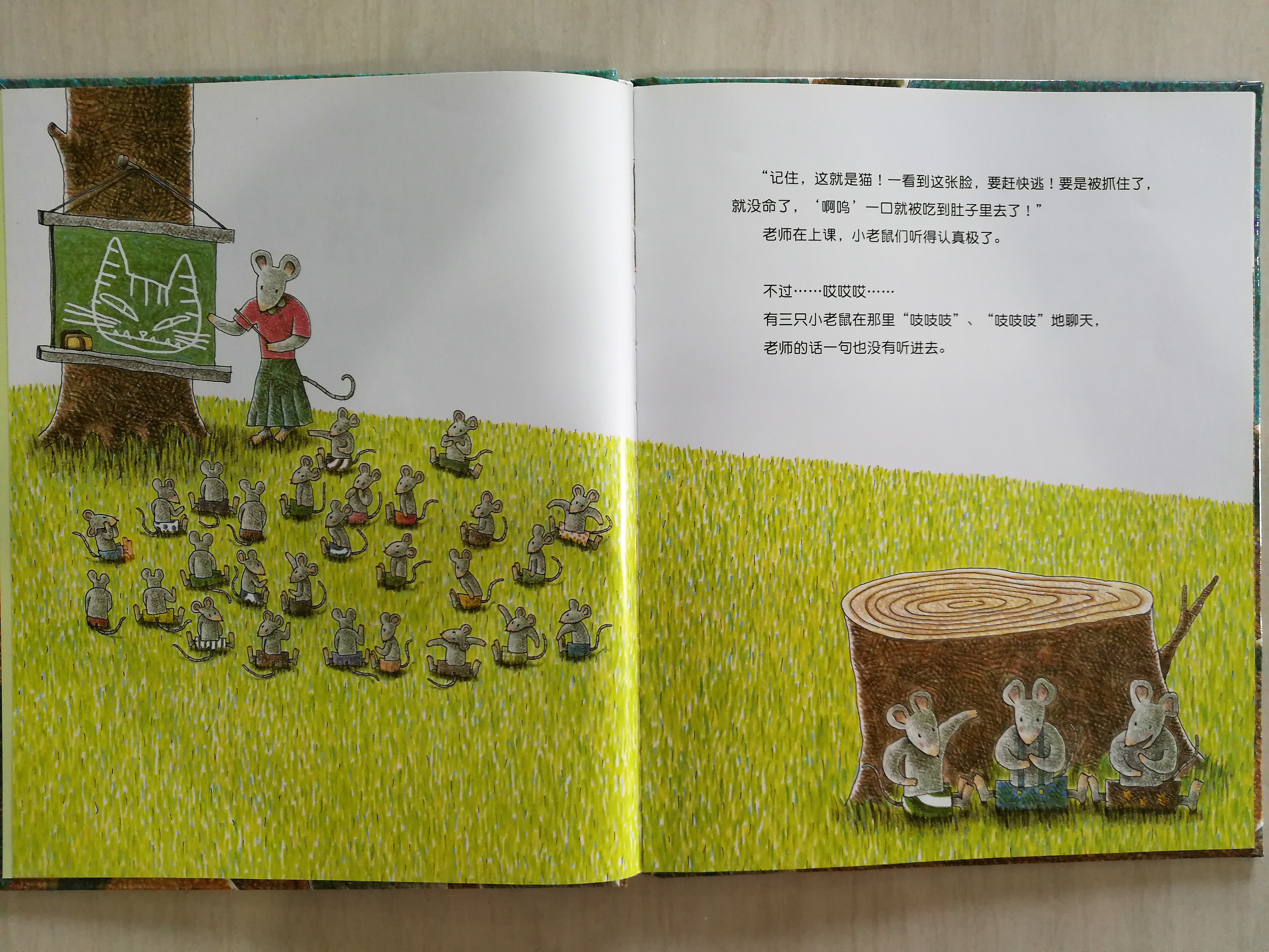 没有预设的偏见,在面对人与事的时候能善意对待,大概是连家长们都需要学习的道理吧!小老鼠或许不是长辈眼里的好学生,但个性都非常善良。貌似凶恶的大猫,其实也同样有(可爱的)名字,有家人,被不知天高地厚的小老鼠们连连释出善意后,已经无法把它们当猎物看待了。多多很喜欢随着故事发展一起“喵呜”起来,是父子俩最近共读非常频密的一部绘本,还爱上吃桃子。是说,别学小老鼠上课不专心听课就好了。。。