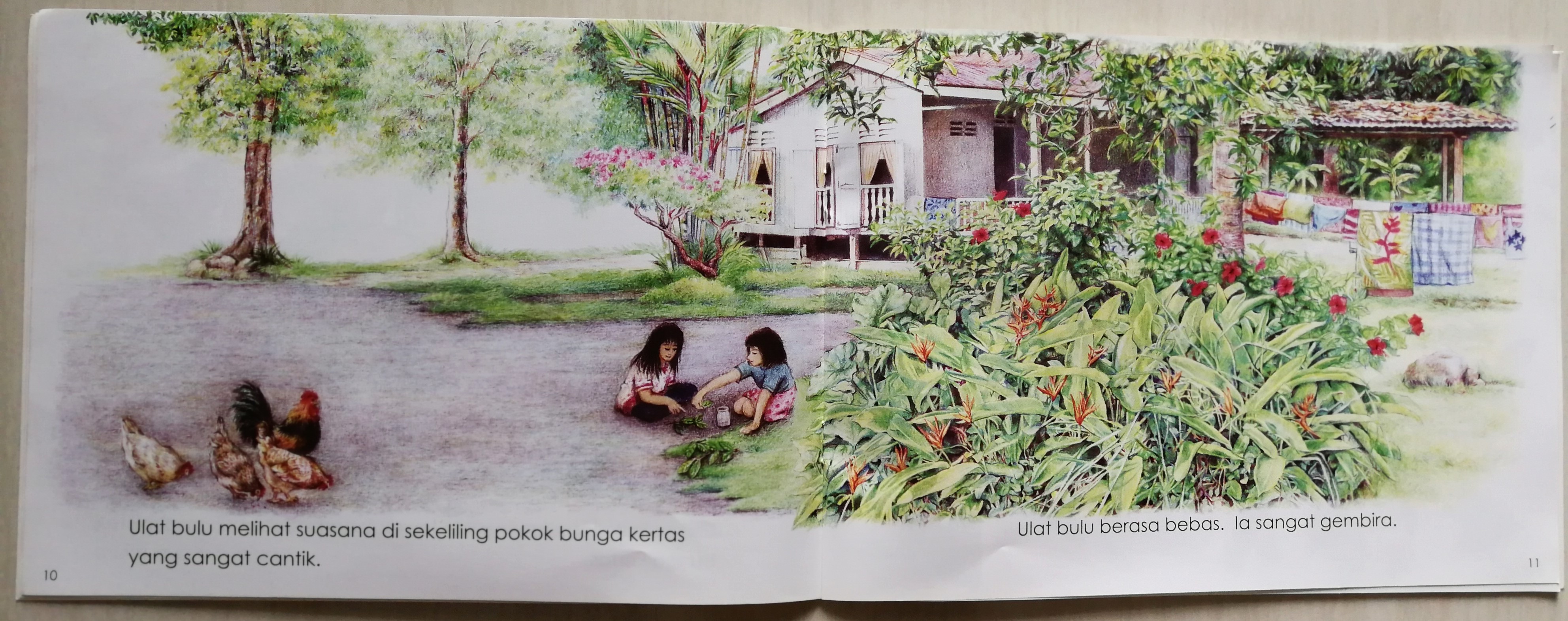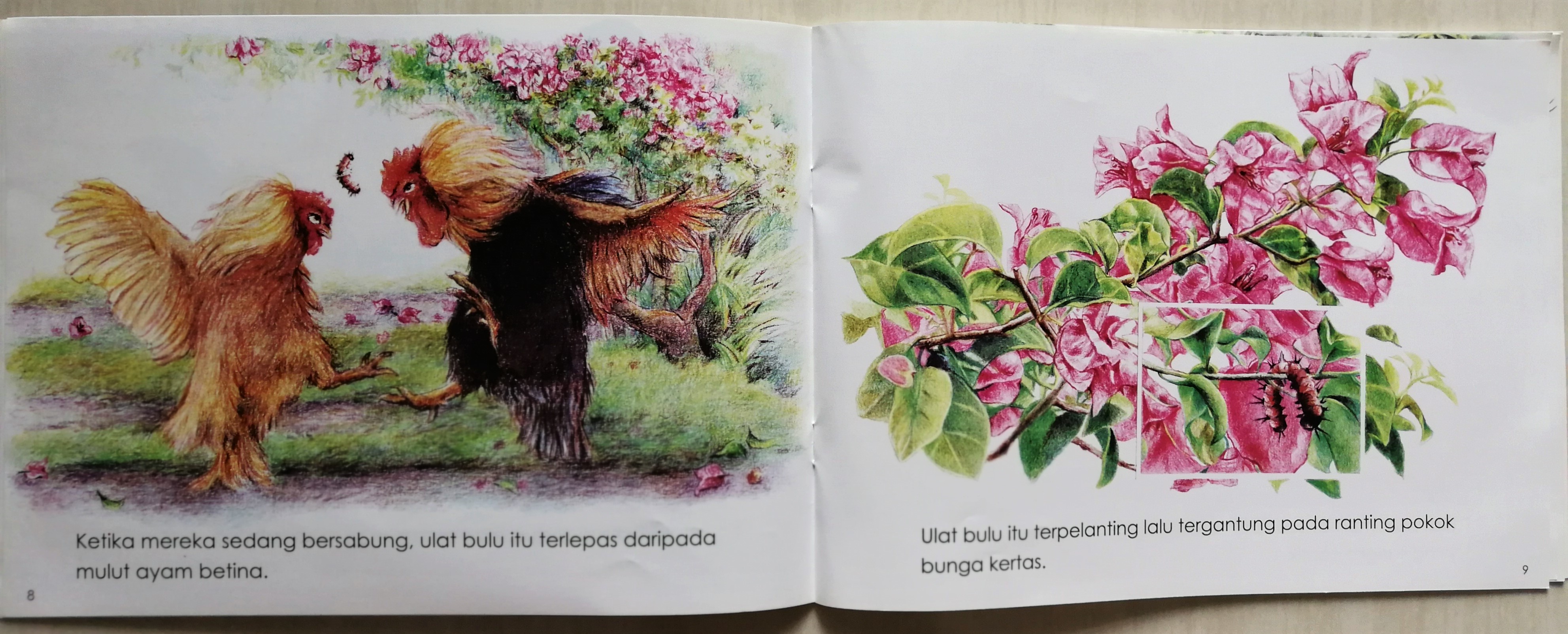 通过绘本,可以感受到作者对淳朴的Kampung生活有着浓厚的情感。一只毛毛虫觅食蜕变的冒险过程,带出熟悉的斗鸡场面,路旁的九重葛灌木,还有儿时与玩伴就地取材玩乐的情景,其实也是很多土生土长的马来西亚人的共同记忆。