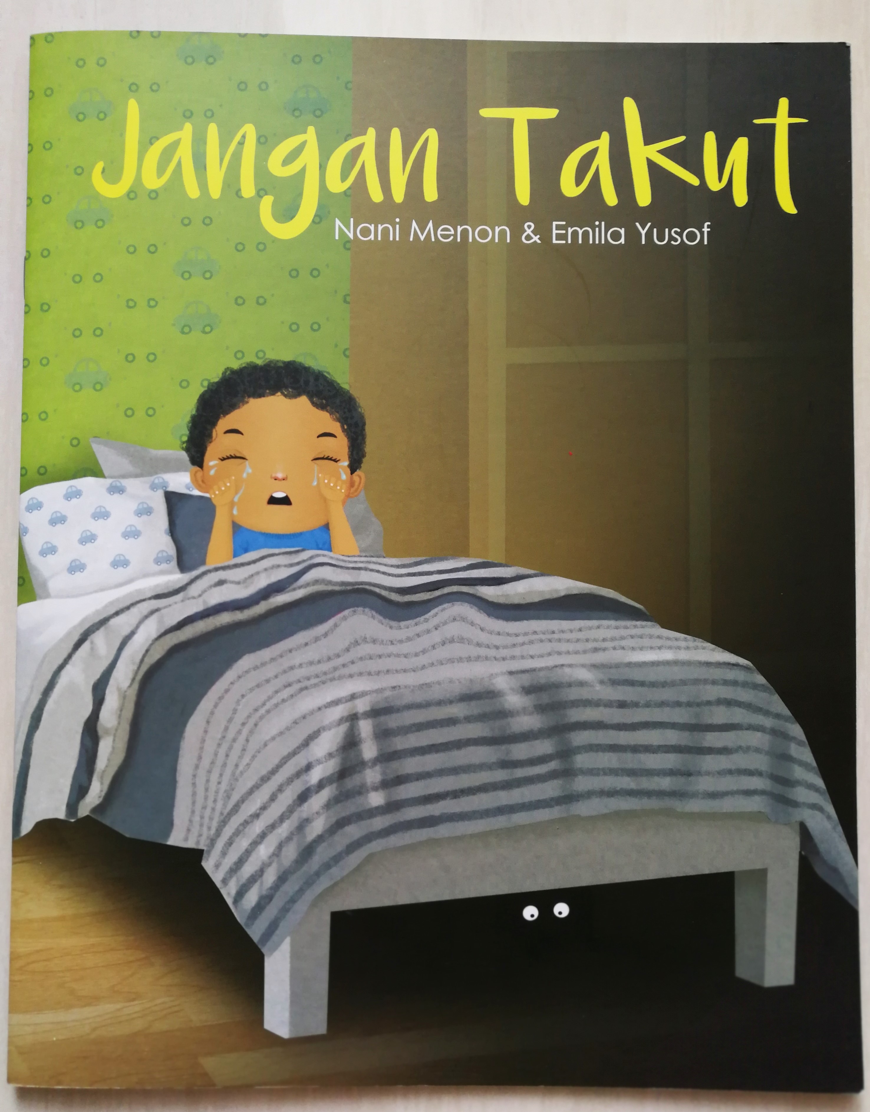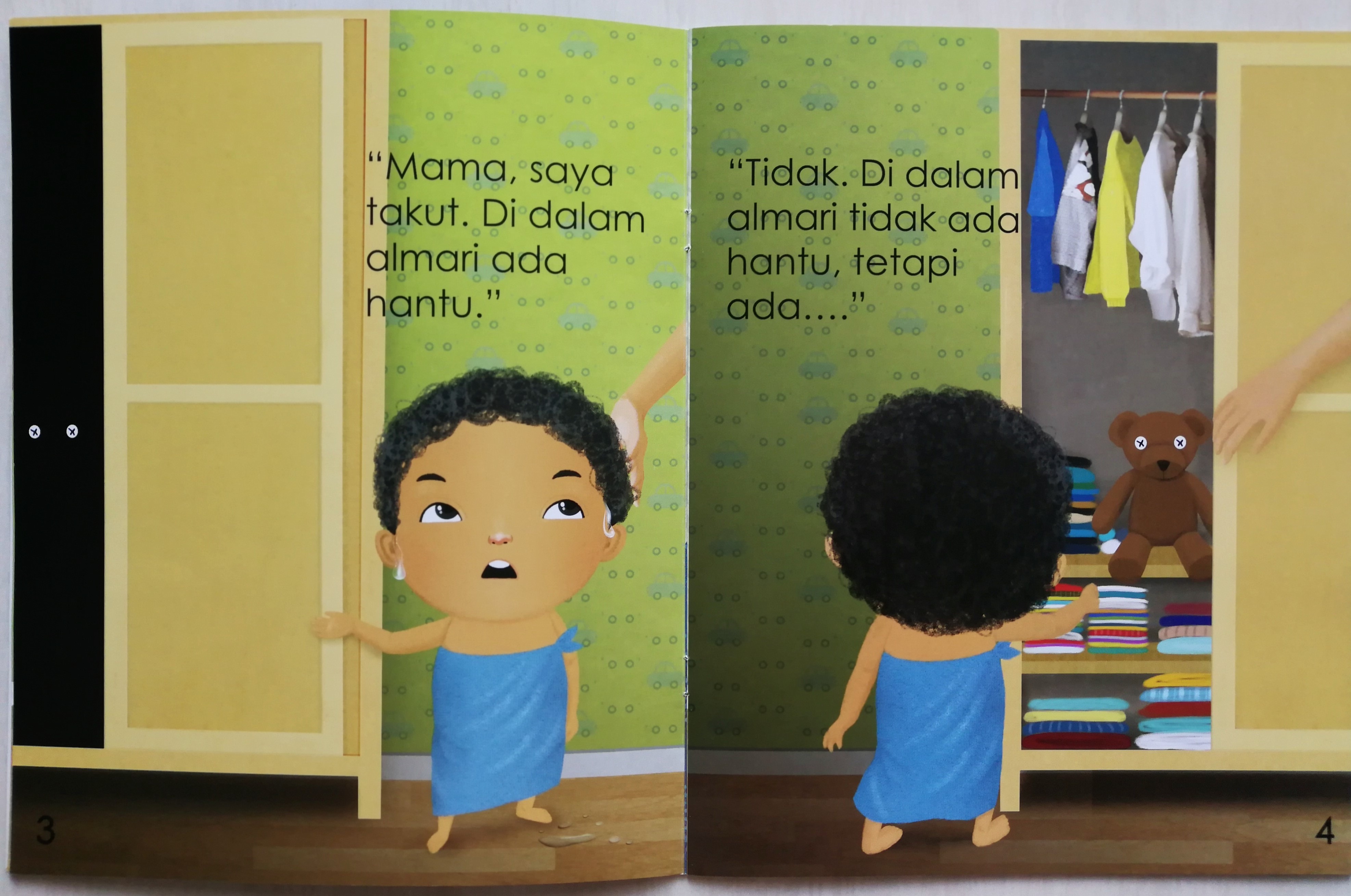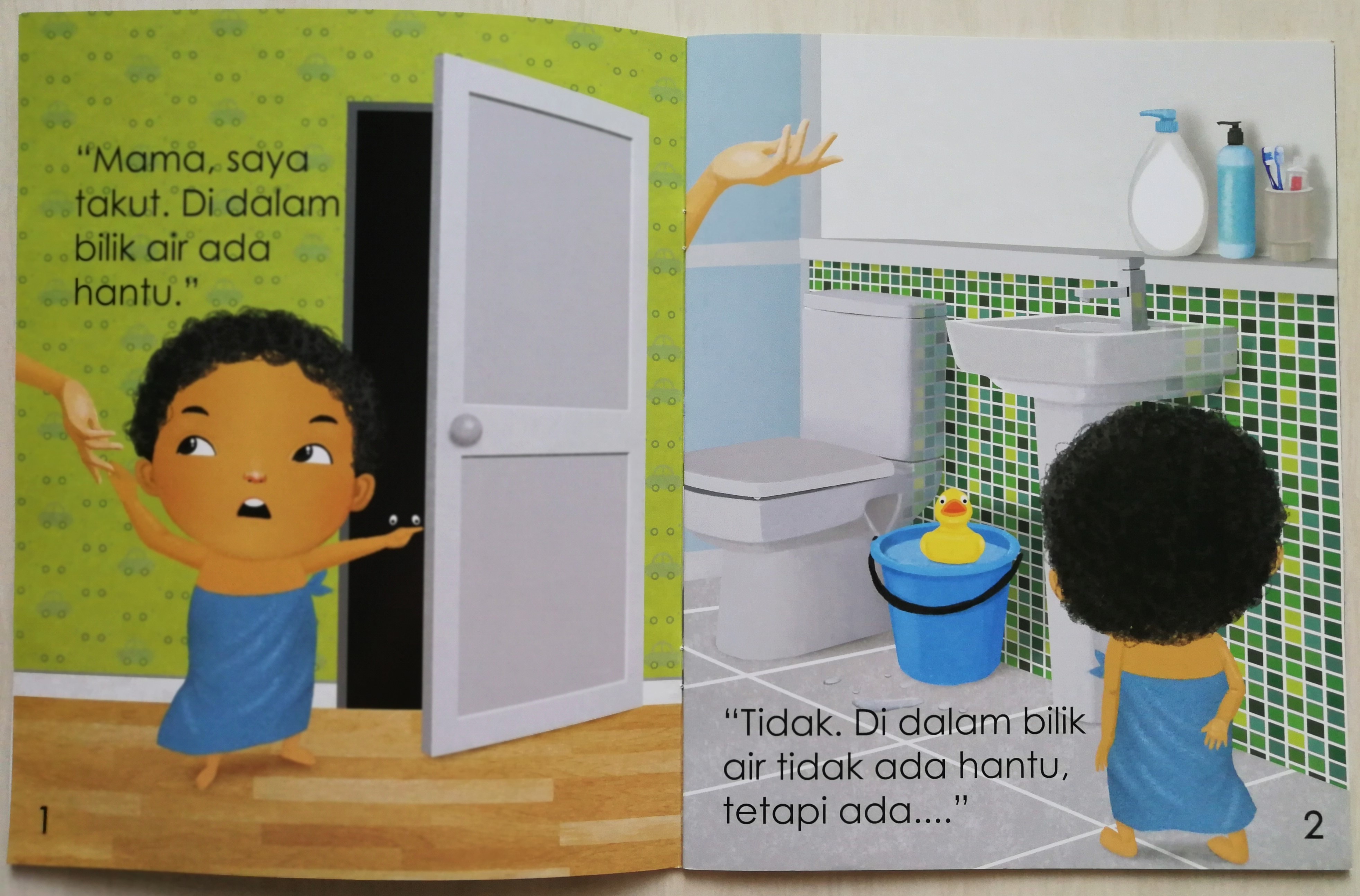 这本出自Nani Menon与Emila Yusof合作系列的绘本,整体质感很好,故事情景简单易懂,文字少且重复率高,适合与马来文词汇量很有限的幼儿共读。“妈妈,我害怕,厕所有鬼” “不是的,厕所没有鬼,那是。。。”,作者用图来揭开“鬼”的面纱:一只小黄鸭。书中内容就依照这样的模式,把孩子所恐惧的对象一一消除。