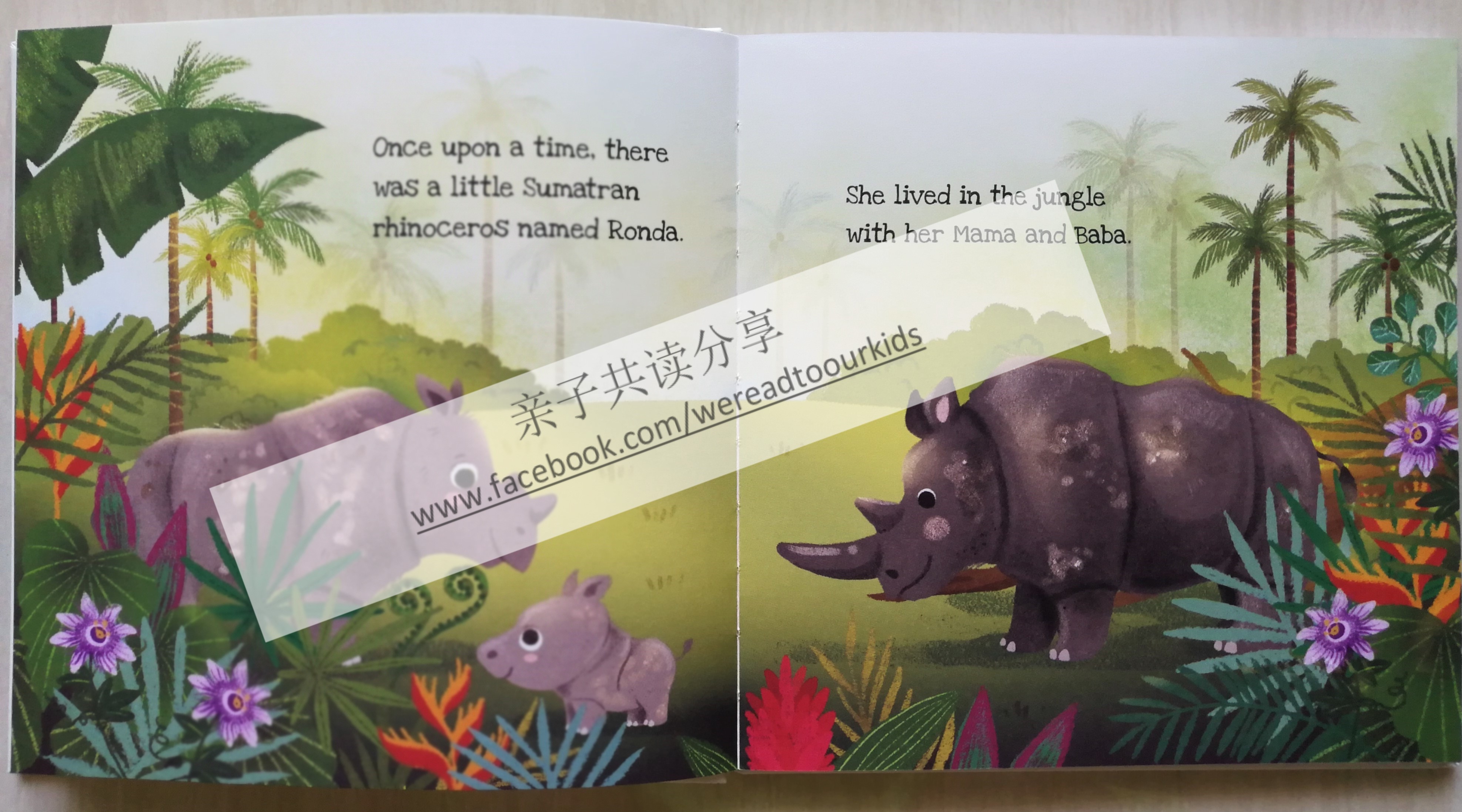 故事通过一只怕事的苏门答腊犀牛,除了带出勇于尝试的寓意,也同时介绍了热带雨林中的萤火虫、树叶、瀑布,还有犀牛靠留下的足迹寻找同类,爱泡泥浆的习性。作者也别出心裁地增加了延伸内容:Rhonda所珍藏的各种热带雨林树叶(绕口的科学名称可以满足特定小孩),苏门答腊犀牛的有趣知识(比如,它们会以类似吹口哨的方式沟通哦!),如何成为生态环境保育工作者等等。插画家这次的作品也更丰富精美,赏心悦目。由于内容丰富多元,建议父母在开始共读时先着重故事情节,待孩子经过数次共读,熟悉故事后,再根据孩子的兴趣介绍其他内容。当然,如果孩子一开始就挑了树叶名称让父母念,也随他吧!(父母保重咯~)