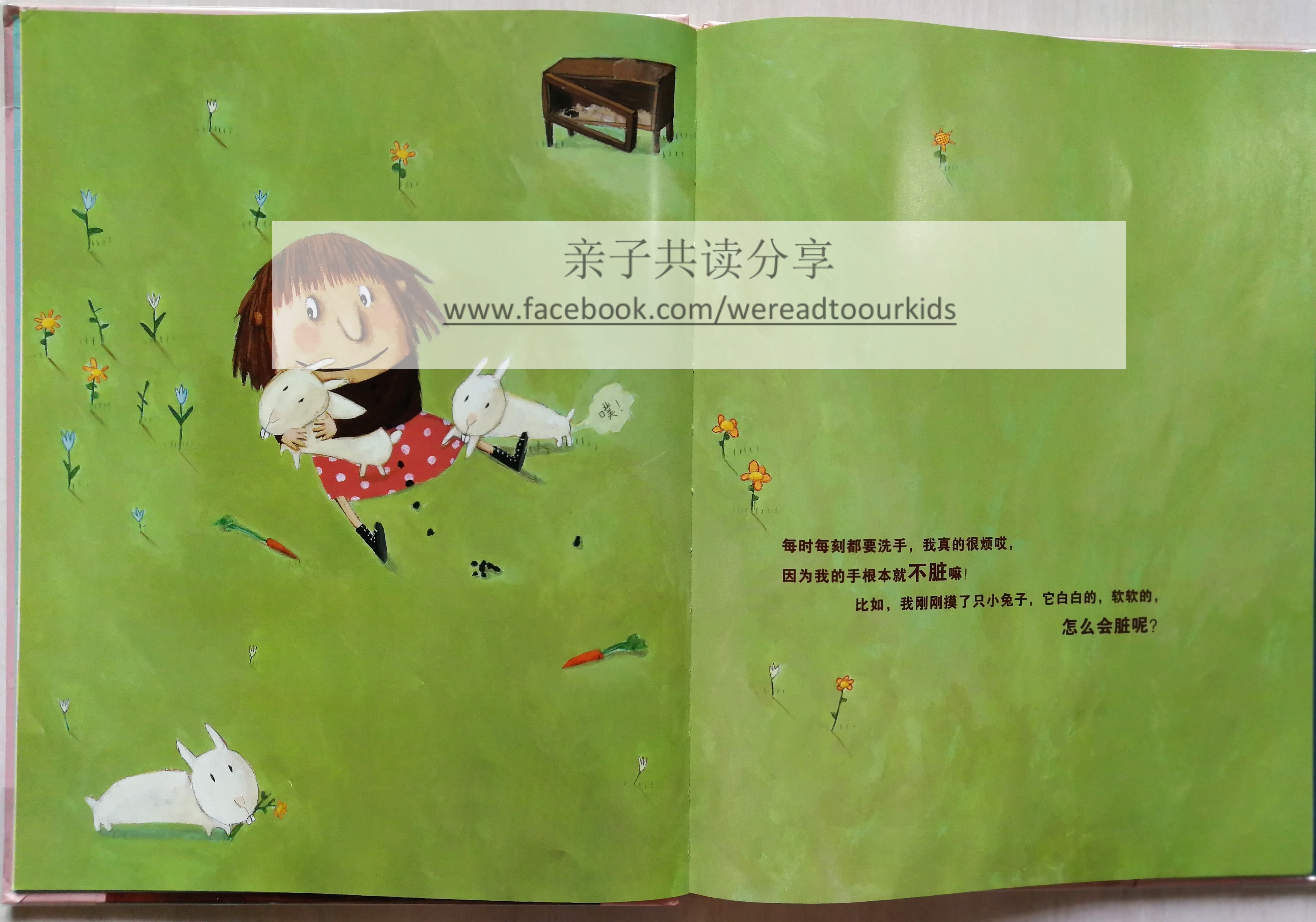 《根本就不脏嘛》特别之处,是从孩子的角度出发,对妈妈总是唠唠叨叨说她的手很脏感到厌烦。 孩子一一举证质疑妈妈的说法时,读者从图画中看到的,却是不同的情景。比如,小孩觉得兔子白白的,怎么会脏。画面却显示孩子抱着的那只兔子,嗯嗯了一颗颗的大便。还有,小孩觉得她吃饭都用餐具,画面却出现她吃面条时一手用叉、一手直接抓住面条。由于多多这个年龄对图画敏感,这些隐藏在图画里的意思(稍加引导)他都能领会。这种表现方式,比平时直接说教有效太多了。故事里的孩子自言自语地觉得生病一点都不好玩,可能要住院,想法仿佛动摇了。 她走到洗手间前,又改变主意,恢复以往不洗手的坏习惯,虽然如此,讯息已经成功传达了。