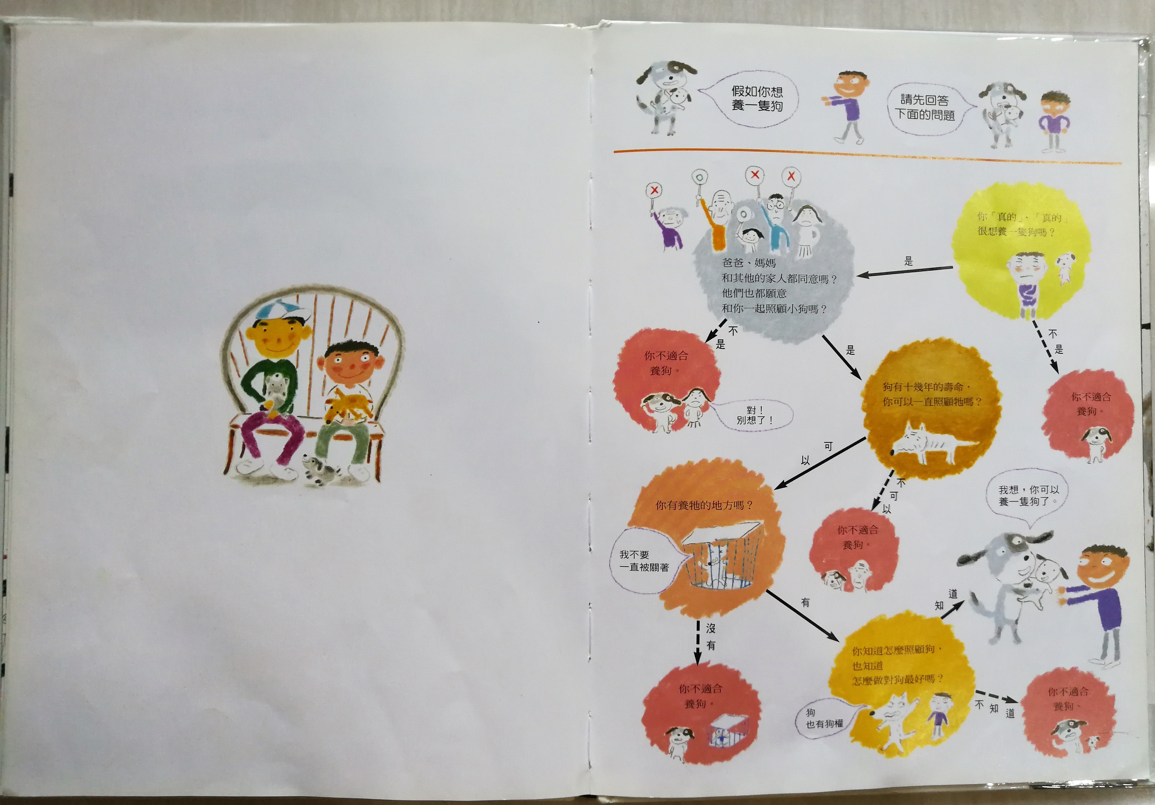 赖马以自己从小与狗狗接触的经验作灵感,以一贯幽默作风,创作了这部绘本。 但是,作者这次明显有比较严肃的讯息想要转达:除了制造一张决策树(Decision Tree)让孩子家长作出各种考量,以决定自己是否适合养狗以外,他也提供关于狗狗的常识以及台湾流浪狗的统计数字。台湾普遍上保护动物意识比马来西亚高,即便如此,弃养和人道毁灭的情况比比皆是。再回头看看马来西亚的狗狗,被弃养被虐打虐杀,加上宗教因素,命运更是坎坷几倍。
