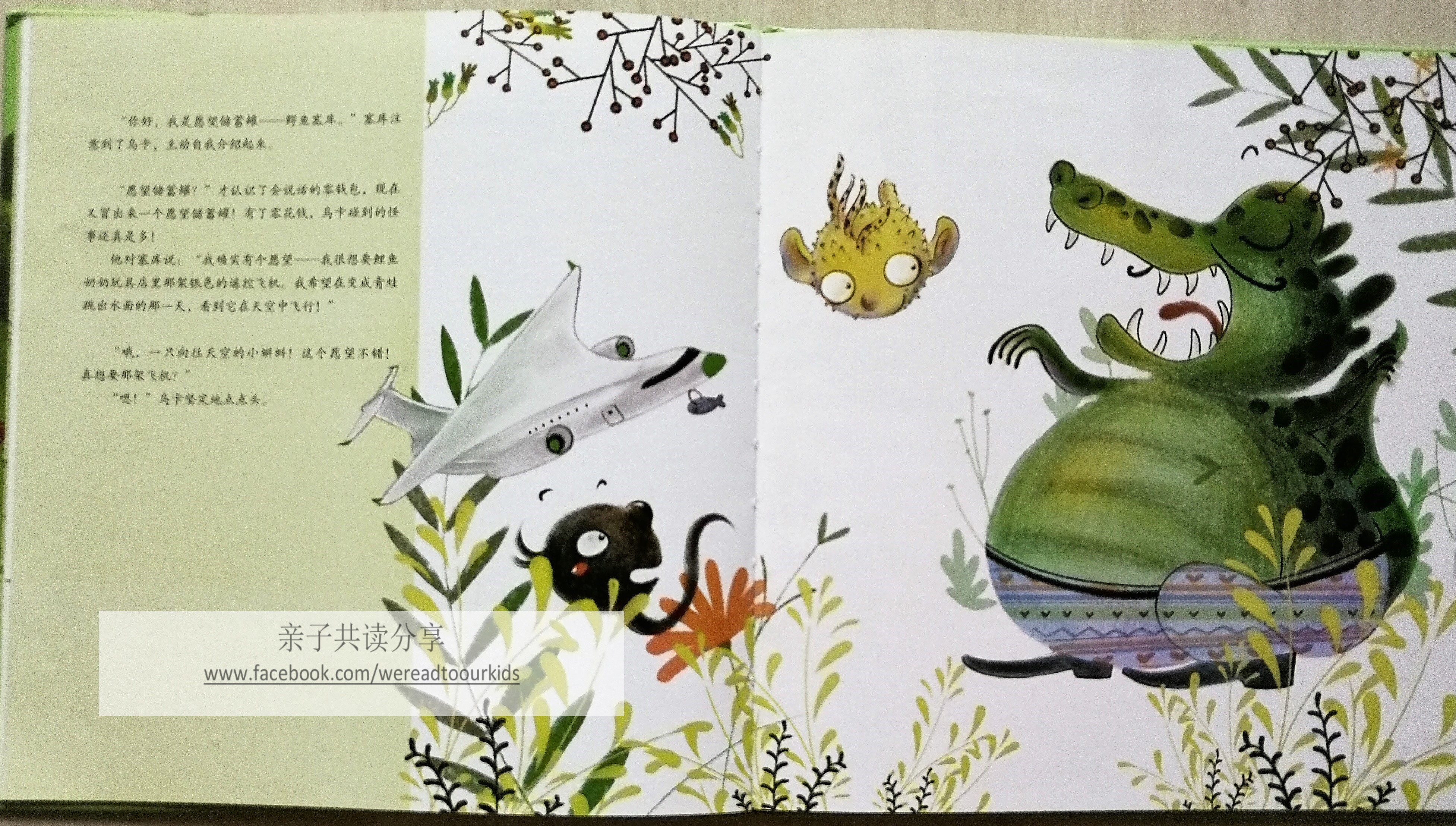 即使内容对于一个当时四岁不到,从来没摸过钱的孩子来说是超龄的,多多依然乐在其中。他喜欢的点也很另类:比如乌卡学校的小朋友,他会想象成他幼儿园的同学;塞库这只有点丑的鳄鱼,是他的最爱(回想起来,他的鳄鱼控搞不好就是那时萌芽的)。我们从第一册一直共读到第四册就停止了,虽然孩子喜欢,但多妈觉得实在太超龄,就把最后一册先藏起来一直到现在。