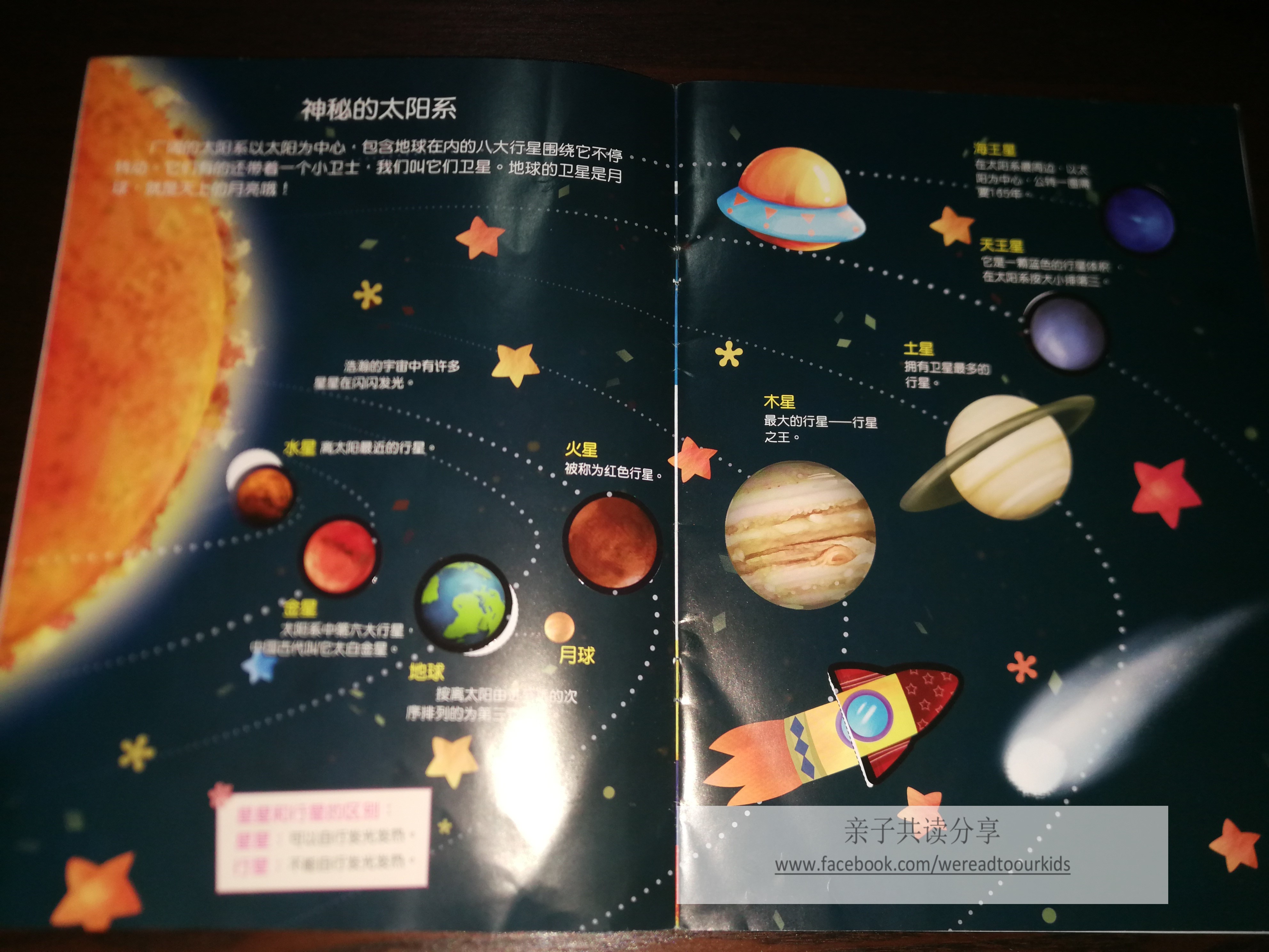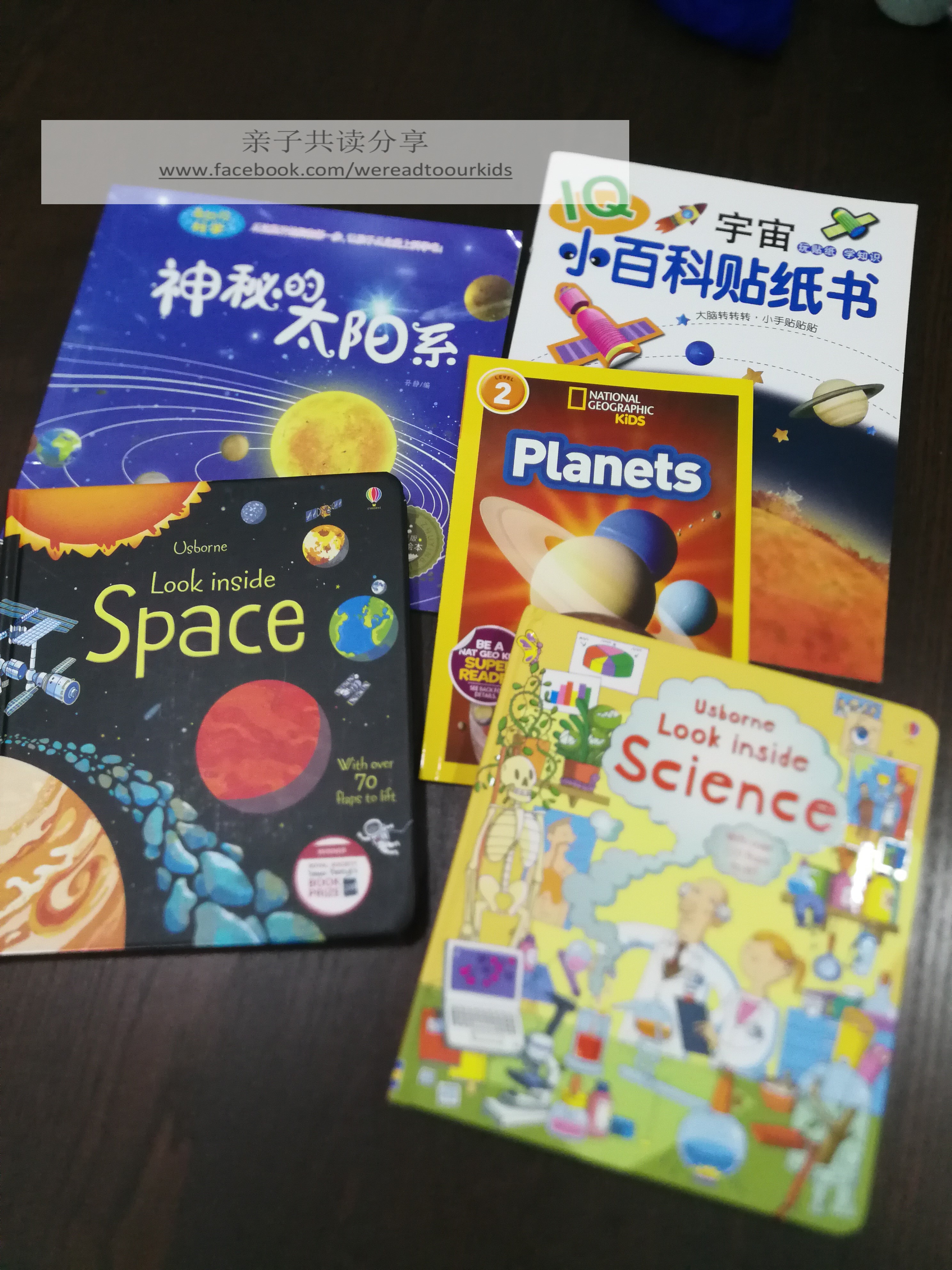 除了两本Usborne,我家还有一本在大众书局就能买到的贴纸书,一本National Geographic Kids Level 2套书里的单本《Planets》,一本早期乱淘个人非常不满意但孩子照样点播的《奇妙的科学》系列《神秘的太阳系》,还有一本儿子特地为了里头的冥王星坚持要买,但目前不知所踪的超龄DK出版的书(请原谅我连书名都不记得了)。