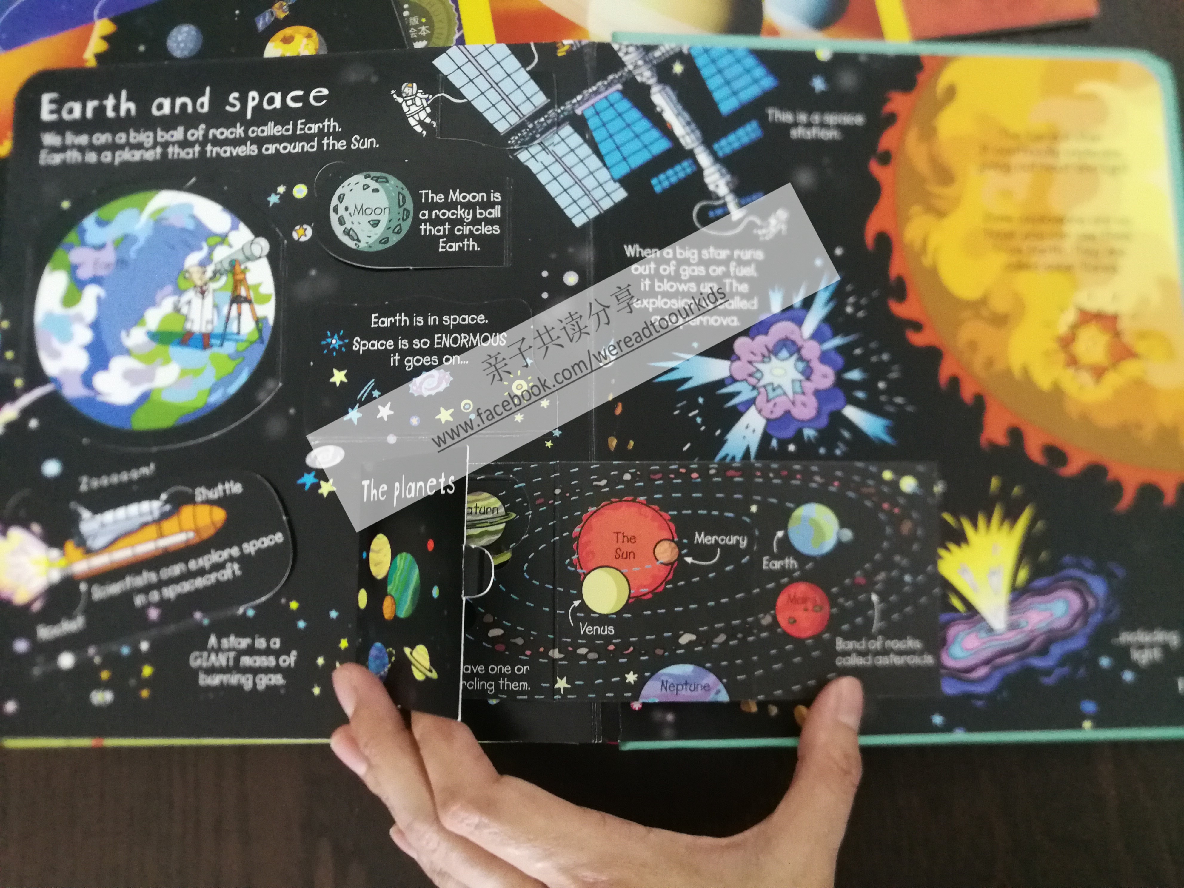 这本翻翻书涵盖材料、植物、人体、光、声、力和太空,内容简单易懂不复杂,图文并茂,算是5、6岁孩子能够理解的入门科学图书。孩子几乎是一开始就对那一颗颗的星球非常感兴趣,问题一个接一个,多妈招架不住,转头又去买了Usborne 《Look Inside Space》。明明内容对于一个当时才4岁的孩子太超龄,但却无阻他每天点播。话说多妈很久远很久远的天文课早就全数还给老师,太阳系行星排列顺位,木星和土星哪个打哪个都记不起来,共读起来真的很痛苦。结果共读了几个星期,又出了下策,把书本藏起来。