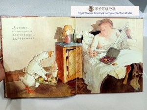 故事内容举出各项鸭子必须完成的工作,每次农夫嚷嚷,鸭子就“嘎嘎”。由于动物们之间的对话都是象声词,共读时只要注意声调,轻轻松松,不怕孩子重复点播而脸青青。个人觉得适合与三岁到六岁的孩子共读。多多一般都只静静听,不像很多共读孩子,喜欢模仿父母边翻边自己讲,但这本是少数的例外。我相信是因为词语的重复率高,很容易朗朗上口,所以他比较有信心不会说错。(我有提过我儿子那没有绝对把握的事情绝对不做的个性吗?)
