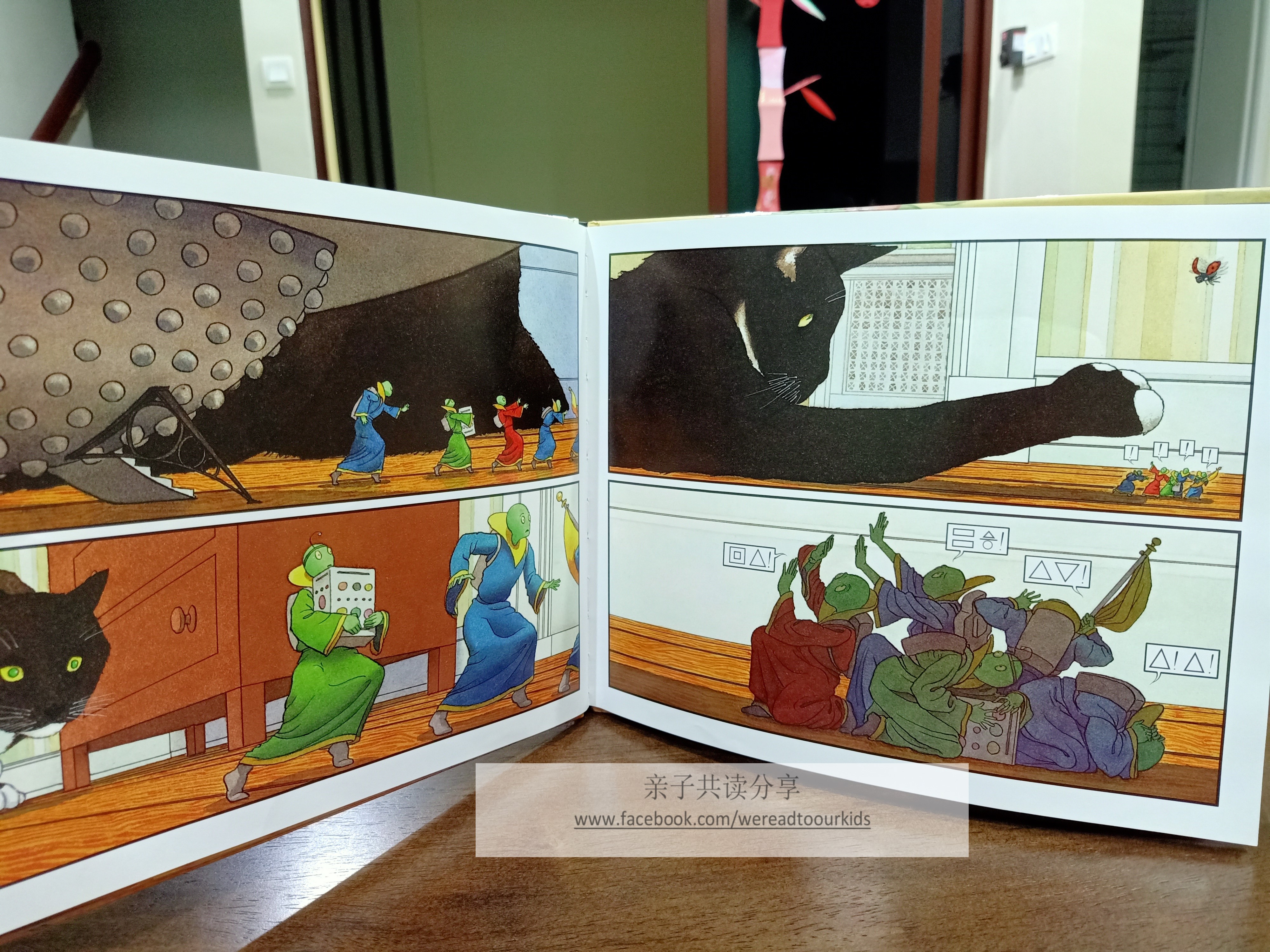 如果说《海底的秘密》发掘了多多阅读无字绘本的兴趣,那《华夫先生!》则是激发多多自顾自地说书:从第一页说到最后一页,讲人语,讲外星语,讲蚂蚁语(?),完全沉醉在其中。《华夫先生!》把场景设在家居,以家居猫做大反派,创造了一部迷你Indian Jones探险记,带领读者经历一场又一场的冒险,是一本大人小孩可以重看又重看的好书。