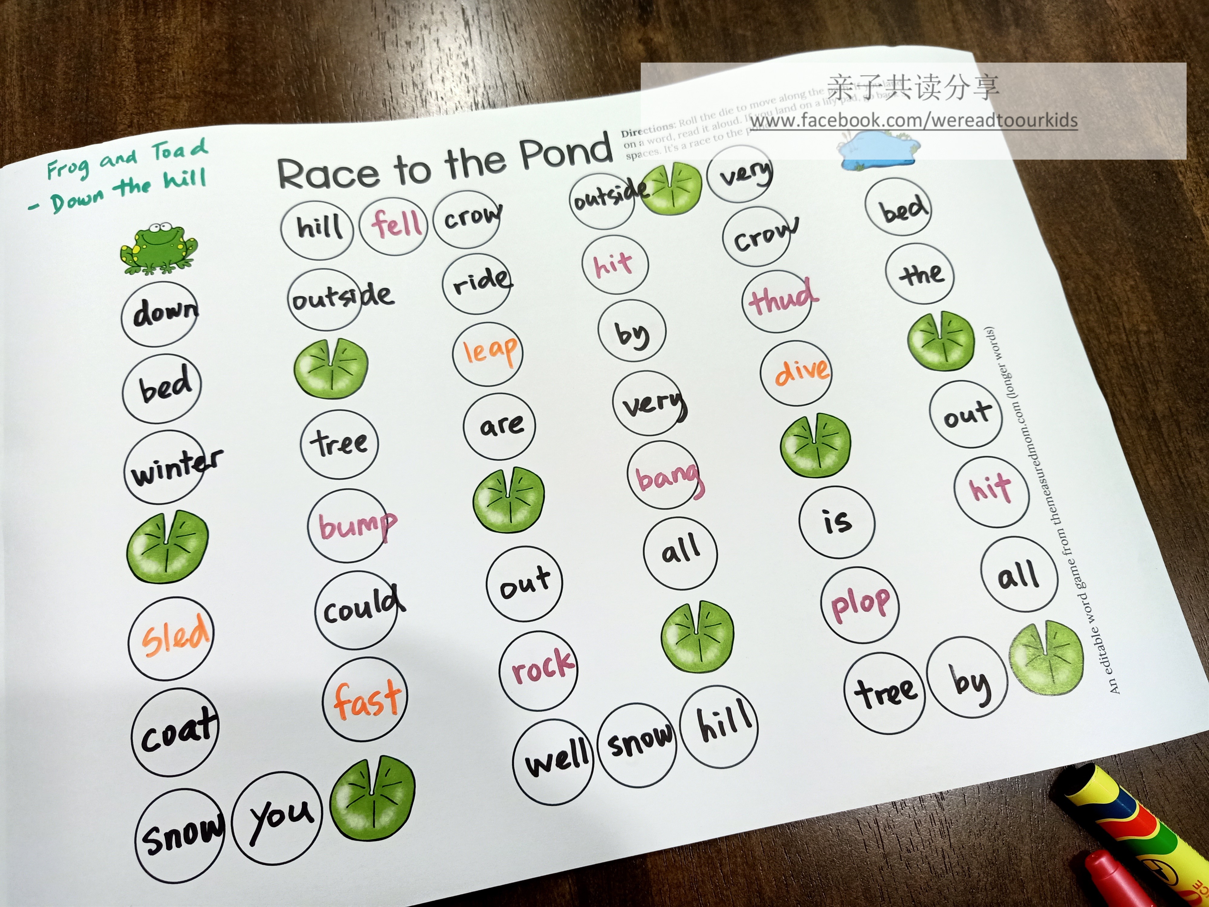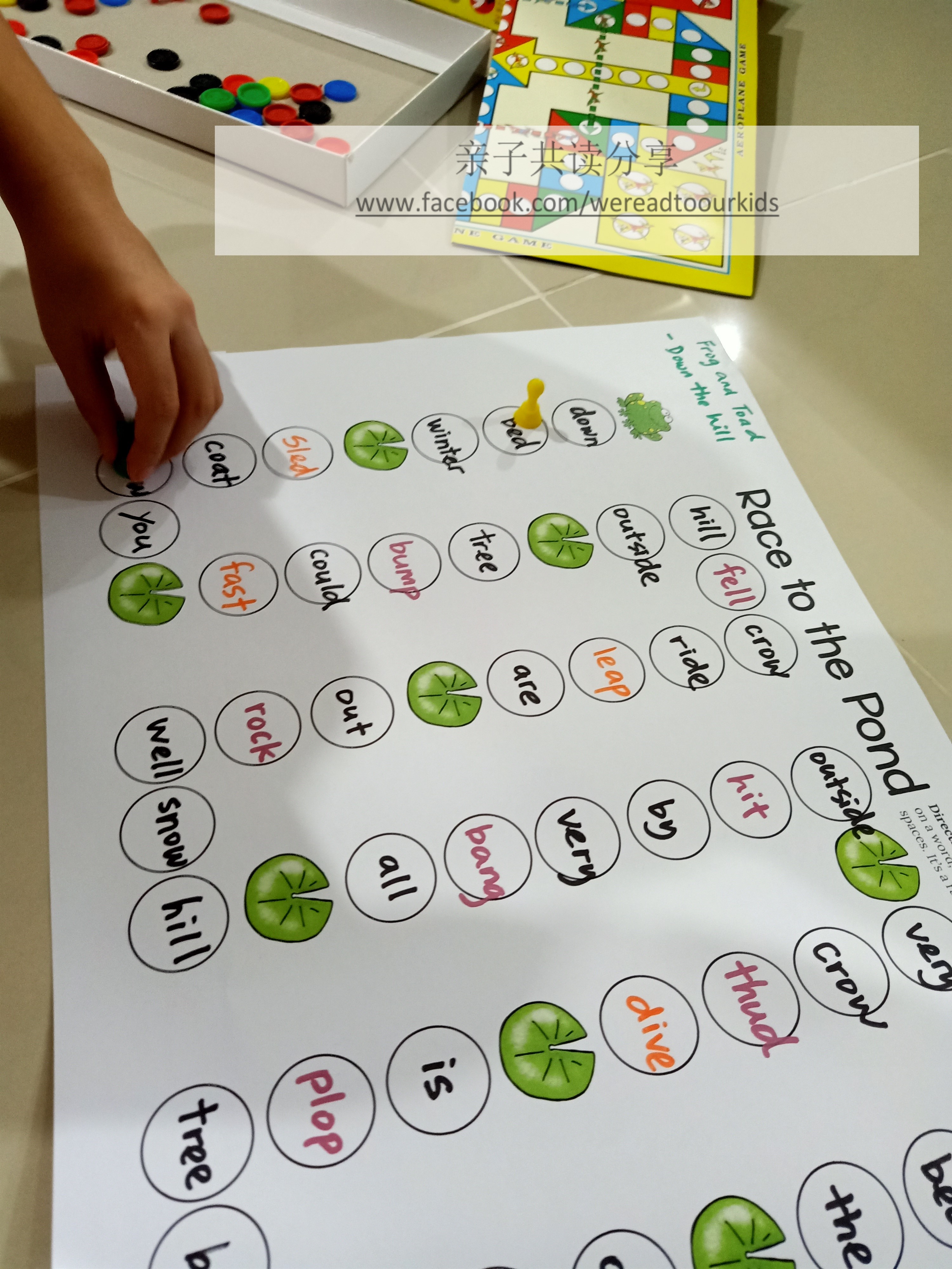 之前在创意学华文群组有家长分享一个以青蛙为主题的简单识字桌游,多妈想到,不如就结合《Down the Hill》的内容和单字,给孩子弄个延伸游戏。