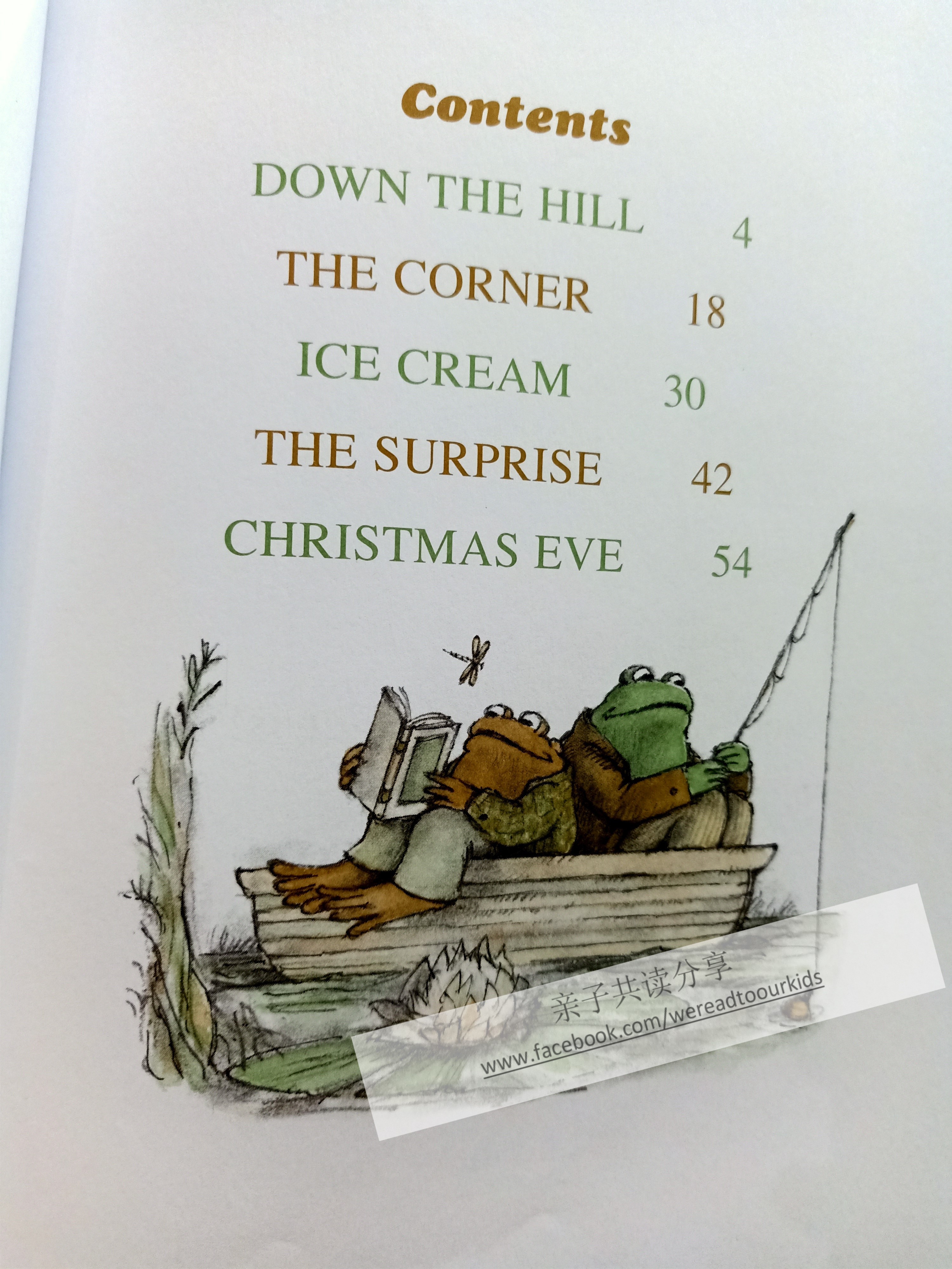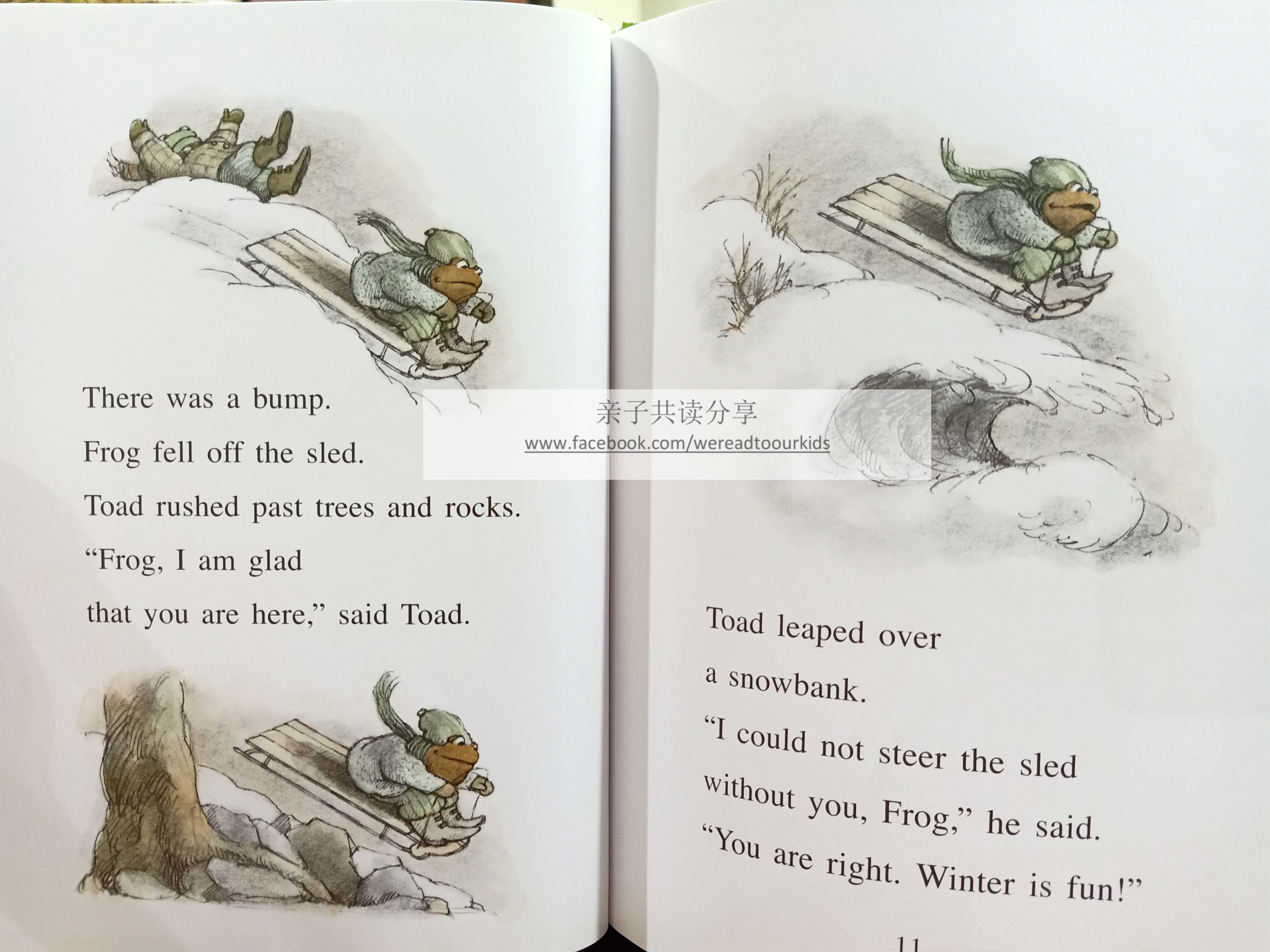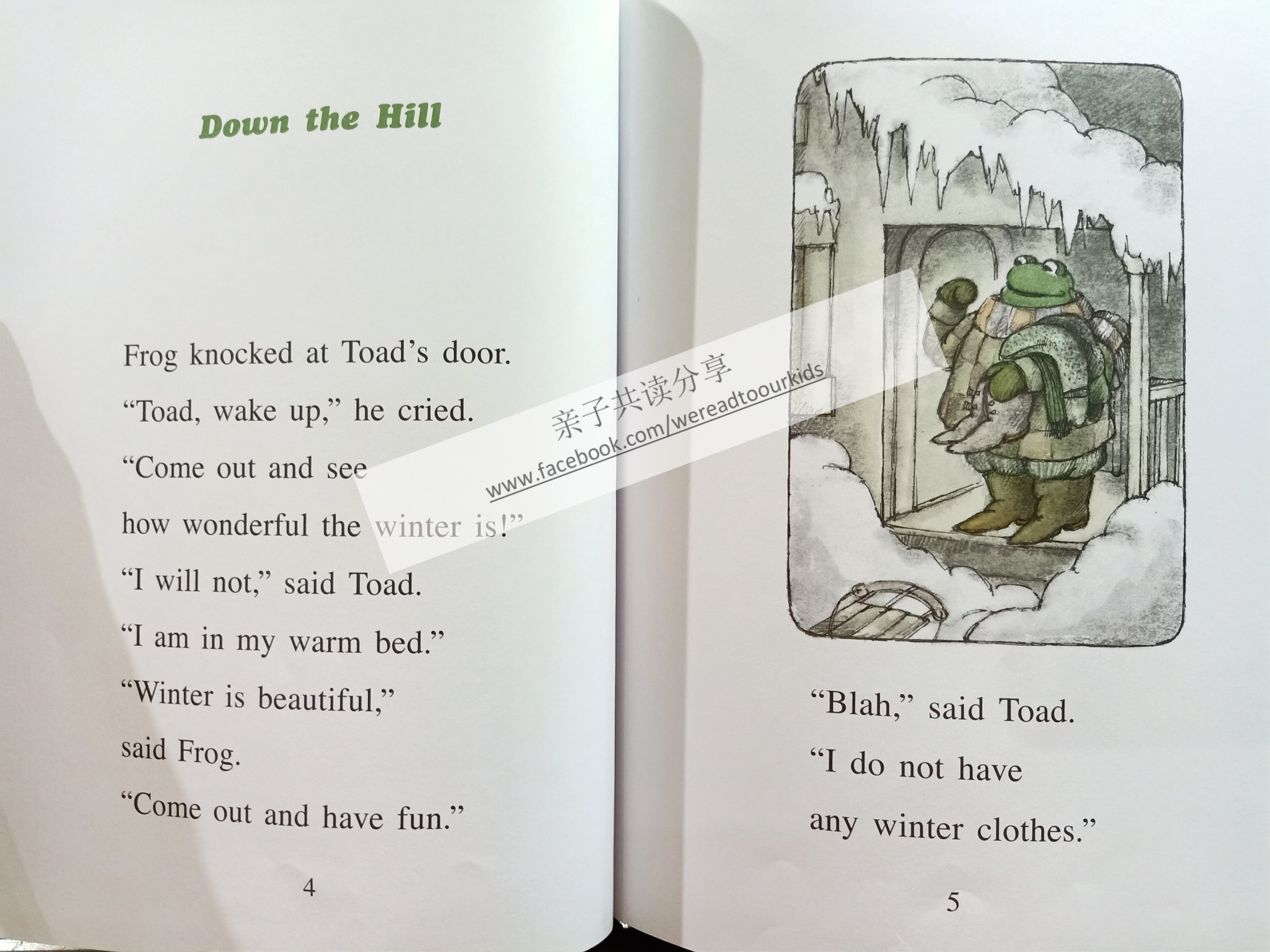 《Frog and Toad》是少数纳入100大英文童书的分级读物,虽然用字简单易懂,故事内容及叙述却一点都不马虎。中文翻译版叫《青蛙与蟾蜍》,也是马来西亚儿童文学协会推荐的童书之一。《Down the Hill 》故事发生在寒冷的冬天。青蛙到蟾蜍家硬把它从温暖的被窝里拉出门,去玩雪橇,享受冬天在外的乐趣。青蛙与蟾蜍共乘一架雪橇滑下山,青蛙坐在蟾蜍后面,一不小心从雪橇掉下来,而蟾蜍却懵然不知,继续冲过树木和石头,跳越过雪堤。。。