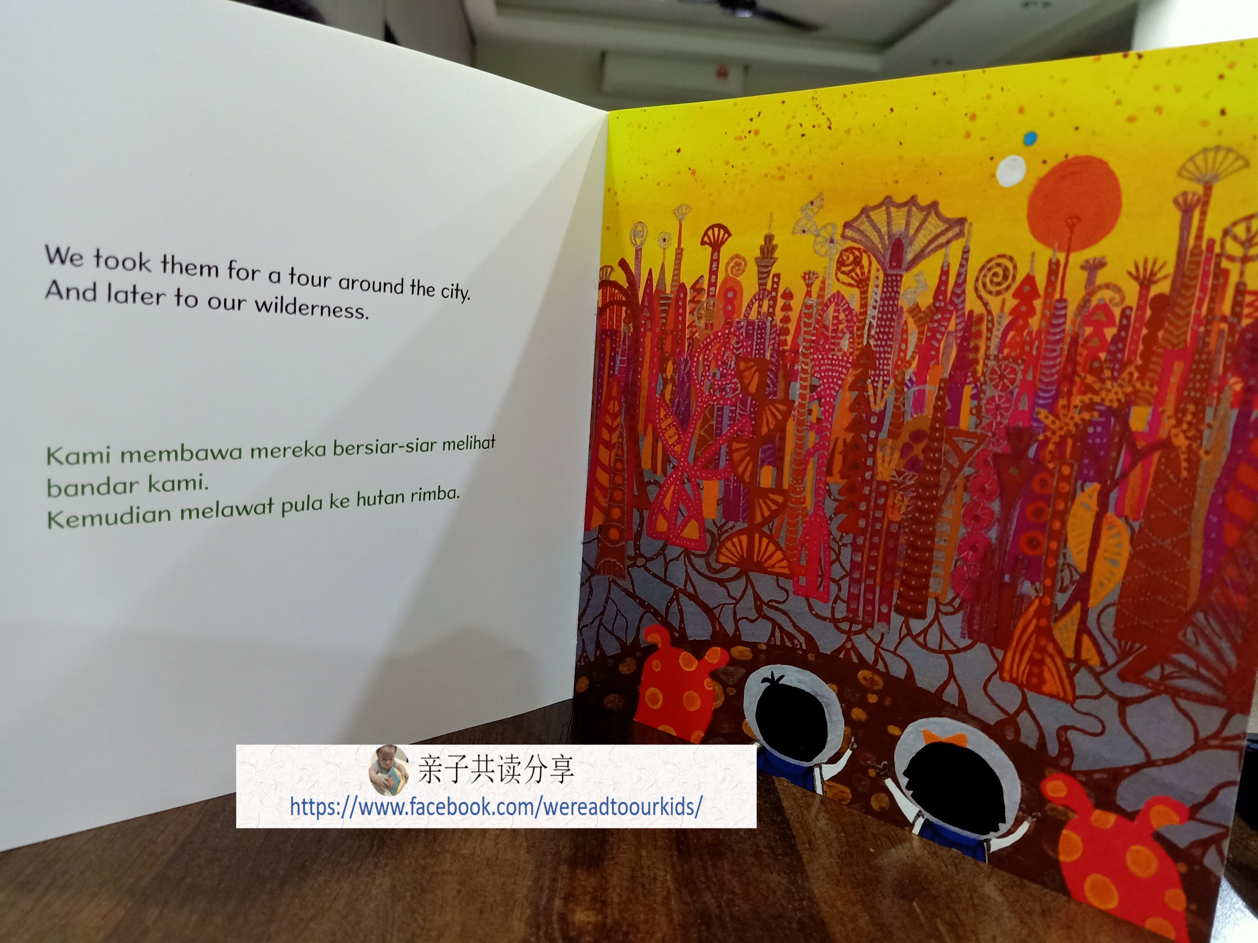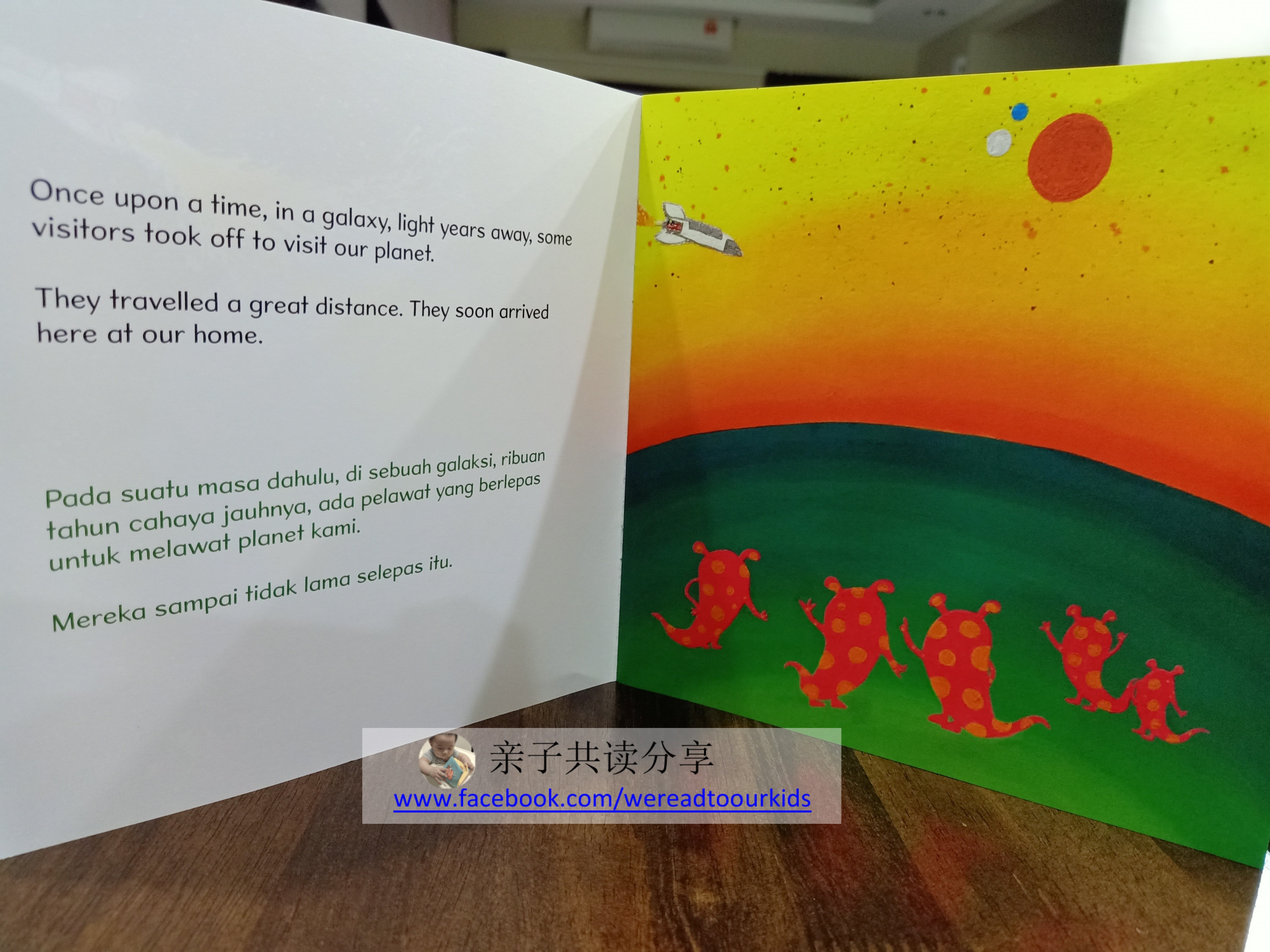 在这本英巫双语绘本里, 被称为“外星人”的访客,来自地球。作者希望通过这样一个观点角色对调的故事,给孩子们带来一个新颖的太空经历,同时让孩子寻思,或许我们地球人与外星人有更多相似之处?