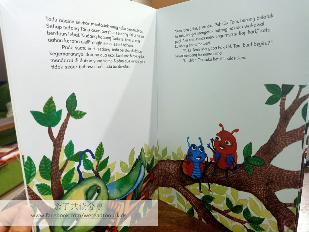 以街坊说三道四为题材的童书,我还是第一次翻读,感觉还蛮有趣的。故事其实简单,但由于作者很详细描述各个角色的举动反应,所以文字比较多。如果大家喜欢《Bangau oh Bangau》的画风,那就别错过这本由同一插画家操刀的本地作品了。