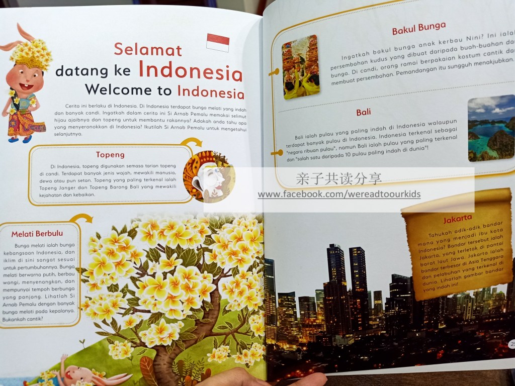 绘本最后附上在故事中提及的印尼小常识,如:面具来源、印尼首都和国花、还有献花的宗教仪式和巴厘岛,让小读者通过害羞兔的故事,对印度尼西亚这个邻国有初步的认识。
