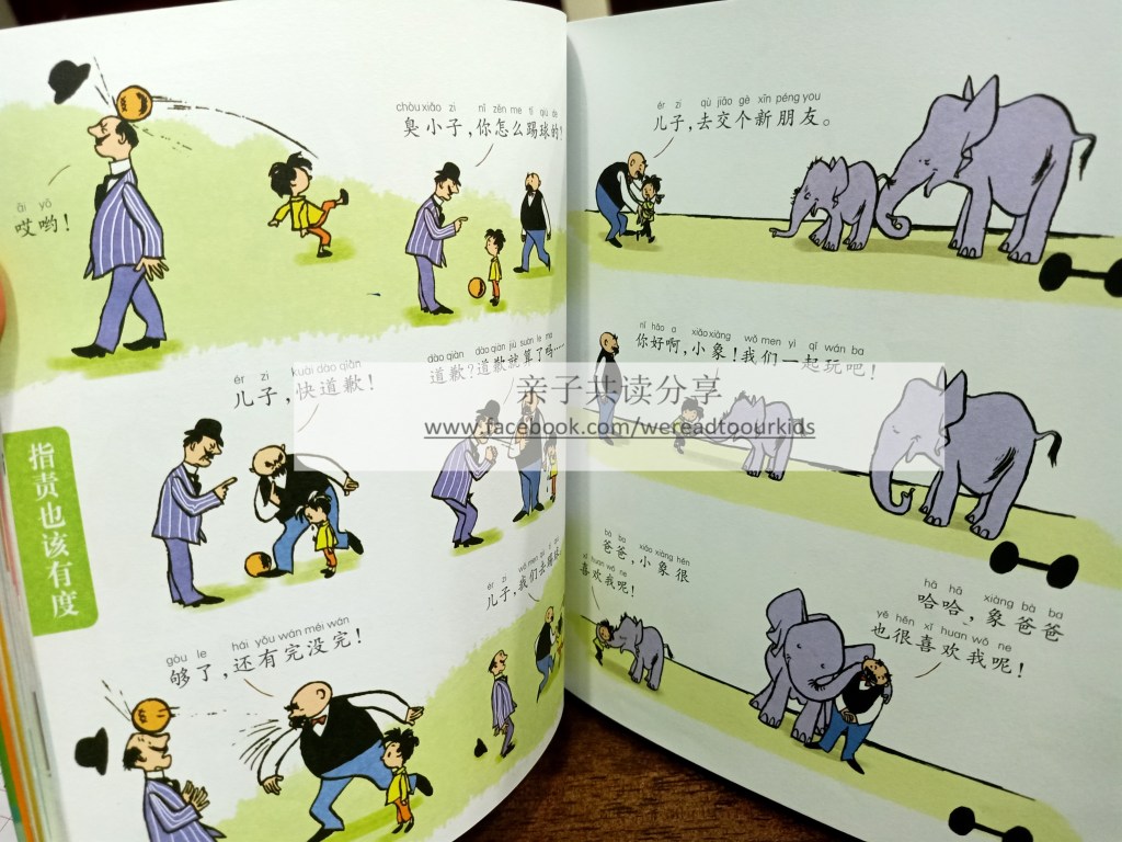为了鼓励孩子从识字转换到阅读,我把《父与子》递给他之前跟他说好,这本妈妈不讲,多多自己看,看不懂的字可以问妈妈。由于是漫画形式,故事也简单,孩子从图画就可以看懂大部分内容。文字不多,重复率高(“臭小子”三个字,多多现在很熟悉。。。),在没有伴读的情况下也愿意长时间翻阅。
