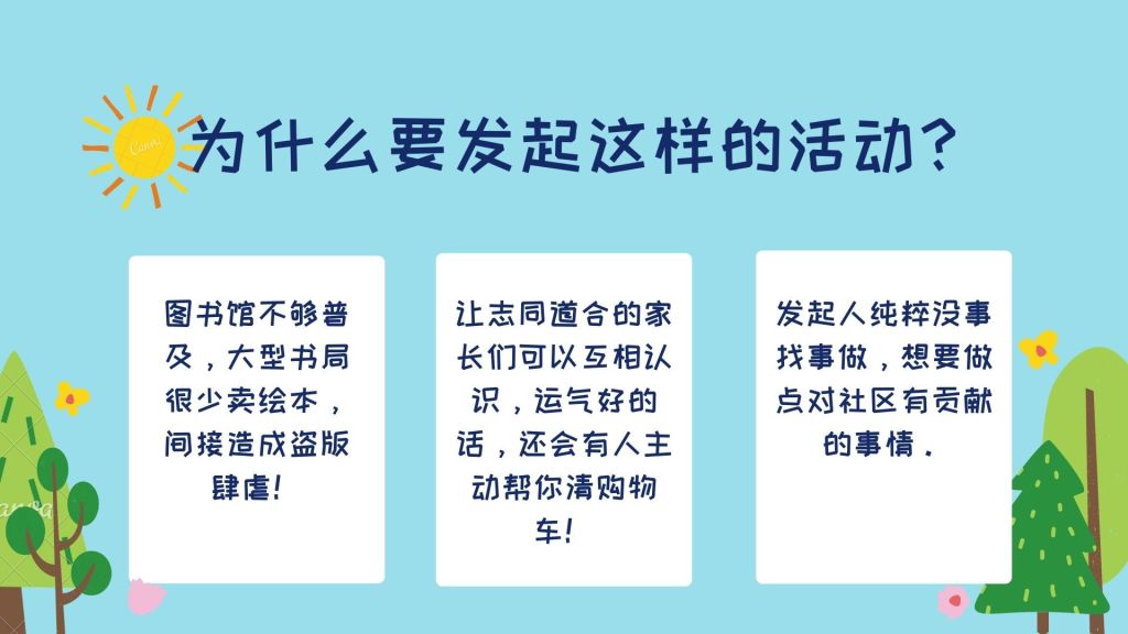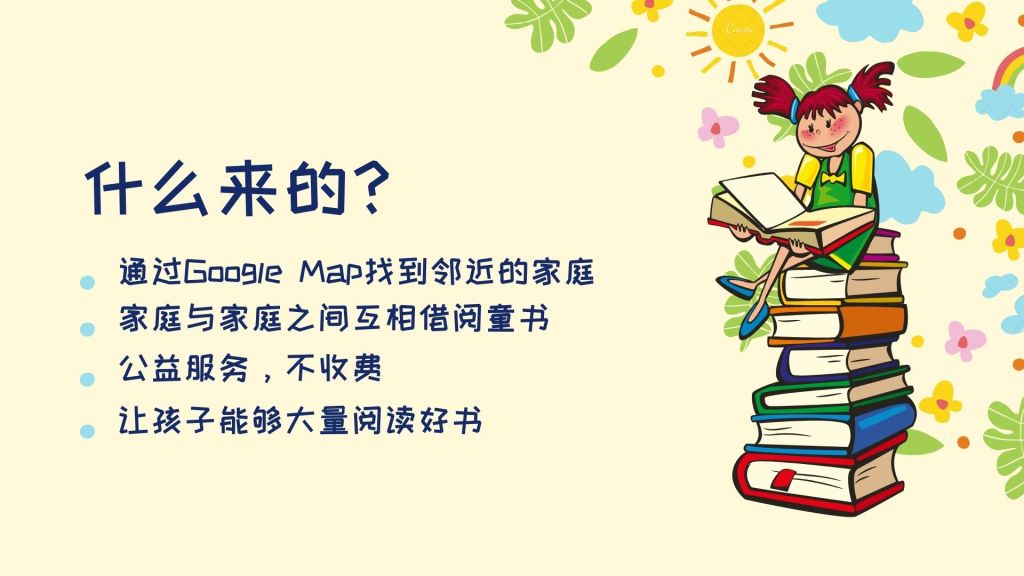 这是一项由【亲子共读分享】FB专页发起,本地三个FB群组【我们在Taman讲故事】【中英绘本毒书党(新马)】【博爱儿童绘本与小说文学】协助推广的社区计划。目的是为马来西亚各地有兴趣交换童书,或者愿意给孩子们讲故事的家长们,提供一个地图式联络簿。