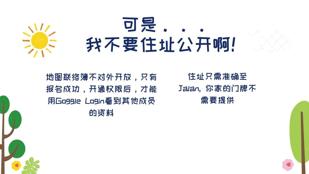 为了保障大家的隐私,地图联络簿并不对外公开。只有用Google sign-in,在报名后接获email邀请的报名者才能使用。