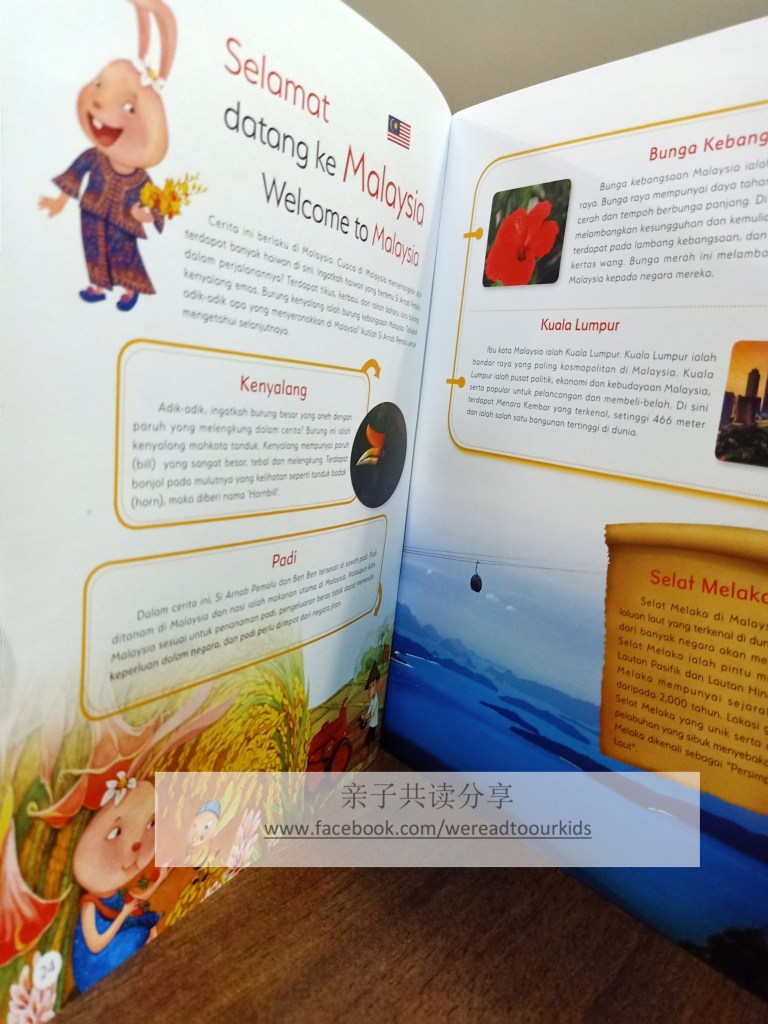 绘本最后介绍马来西亚首都吉隆坡、国花、犀鸟、稻米和马六甲海峡,让小读者通过害羞兔的故事,认识认识自己的国家吧!