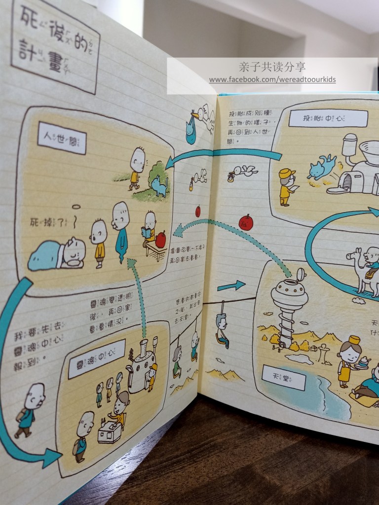 这是一本没有提供答案的绘本。作者抛下很多问题,让大人小孩各自思索。是鼓励大家都应该有一本笔记,当作是一次勇敢面对死亡,这个没人可避免的将来?还是为了具体让家人知道自己的心意,或是一次对生命意义的自我反思?正当我以为共读这本绘本,希望能带给孩子对死亡课题的一丁点初体验时,多多冒出了以下这段话: