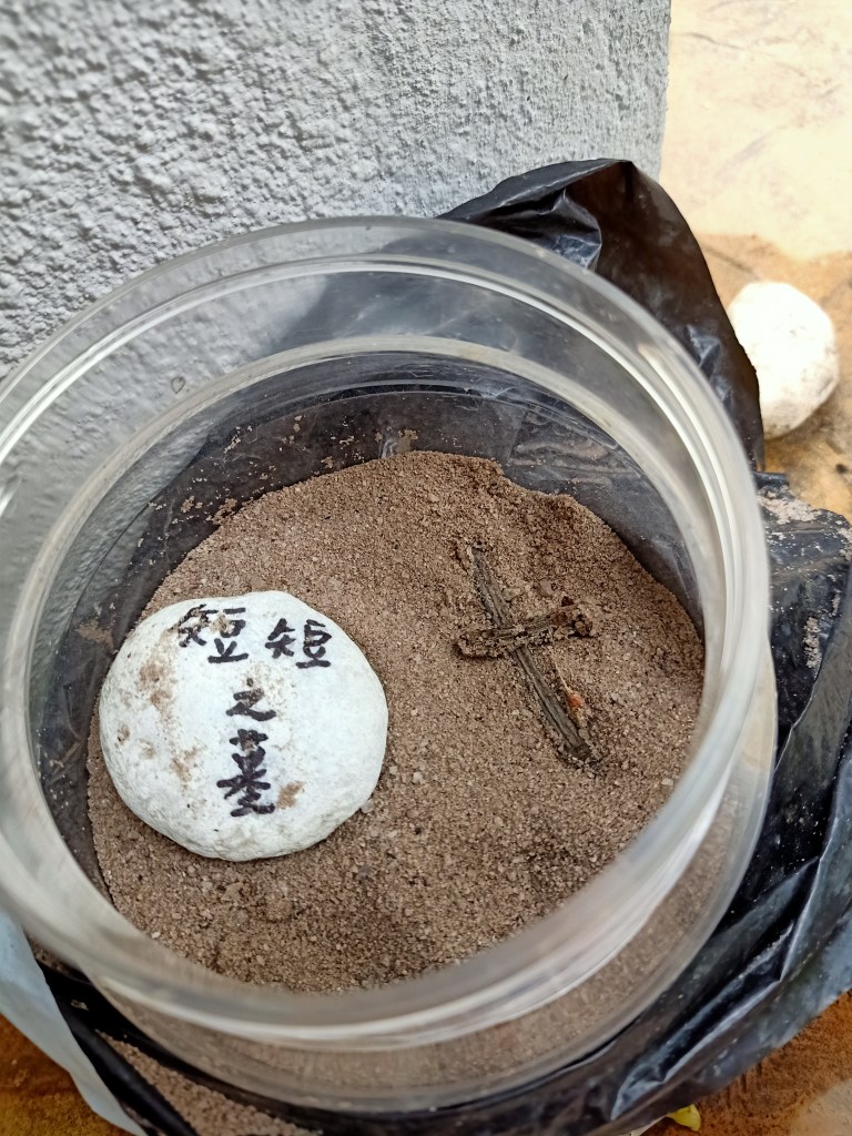 后记:帖文一出,隔天儿子就通知我,短短死了,父子俩还给她立了个坟墓。上网搜了一下,马陆的寿命是一年以上。以多多的说法,短短是个老奶奶,寿终正寝。我则觉得是取错名了。。。