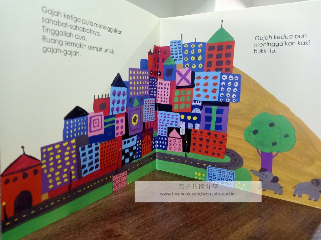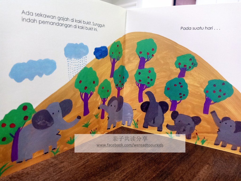 与《Where’s the Elephant》同工异曲,小小读者能够清楚感受到人类活动对于自然生态所造成的破坏。文字比一般马来童书精简,即使不看文字也能通过图画了解故事。以内容来说,三岁以上的孩子能理解。但如果你家孩子跟我的一样,马来文环境非常缺乏,对马来文的认识仅局限于少量单字,那我会建议5岁或以上共读。