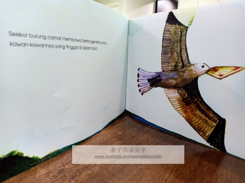 一只海鸥为它的海洋朋友捎来一封好消息。首先看到信件的是两只水母,接着三条鱼,四条魔鬼鱼、五只海星、六只海虾。。。各式各样的海洋动物聚集一堂,海鸥在等着大家呢!到底是什么好消息?