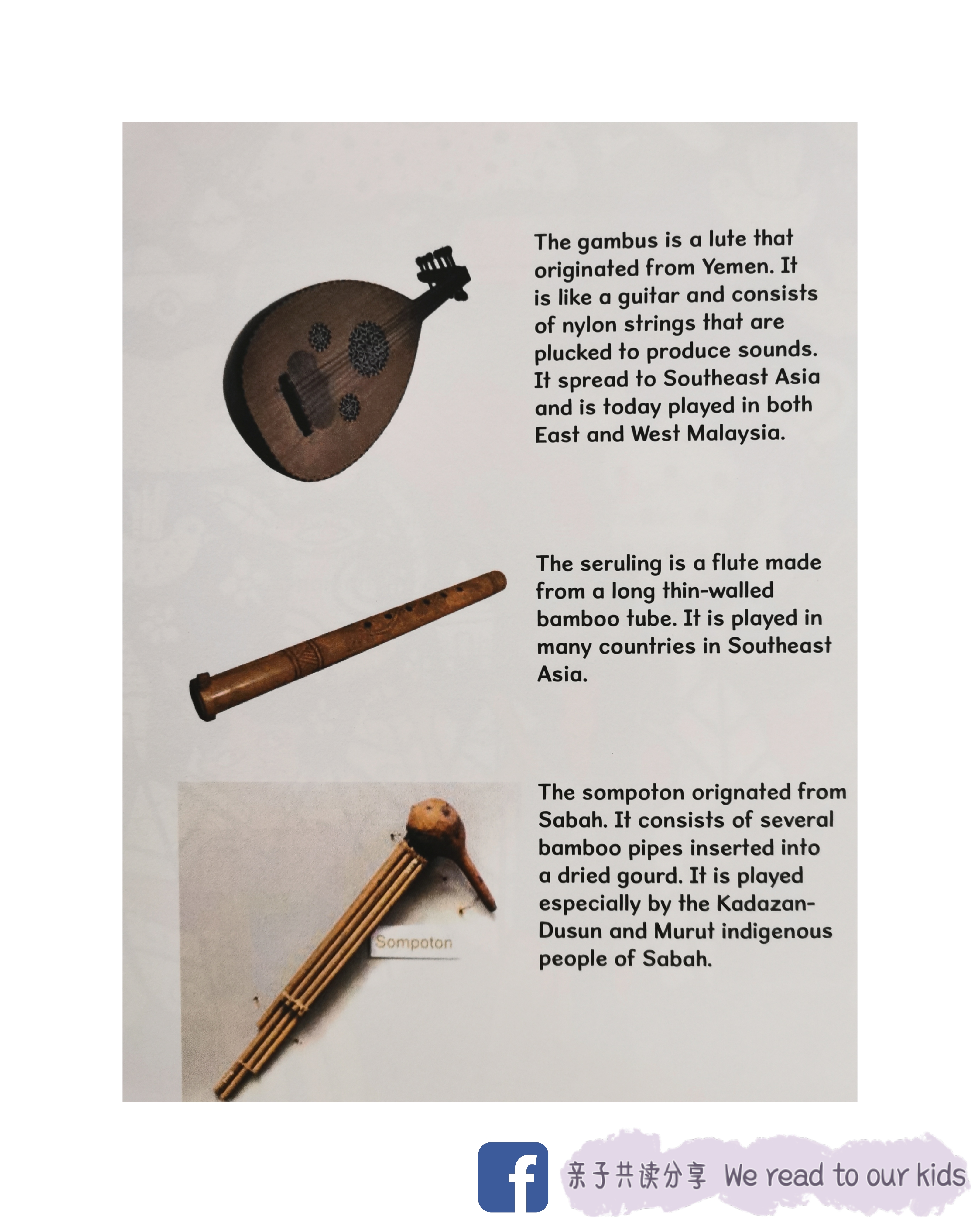 作者透过简单的故事向我们介绍马来西亚的传统乐器,那就是 gambus, seruling 以及 sompoton。以下是我从网络搜得的资料: