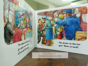 这本书勾起很多与孩子共读的回忆。这首歌的韵律很好听,也很好发挥动作。大概半年后,每当唱到“The driver on the bus goes move on back…”多多会扭腰半转身,用他那胖胖的手臂模仿我的动作)。唱到“The driver on the bus says shh shh shh”,一开始只是全身关注地看着我,到后来他也举起食指,尝试发出shh shh shh的声音,宝宝海绵似地吸收,动作笨拙萌呆的样子,到现在还历历在目。