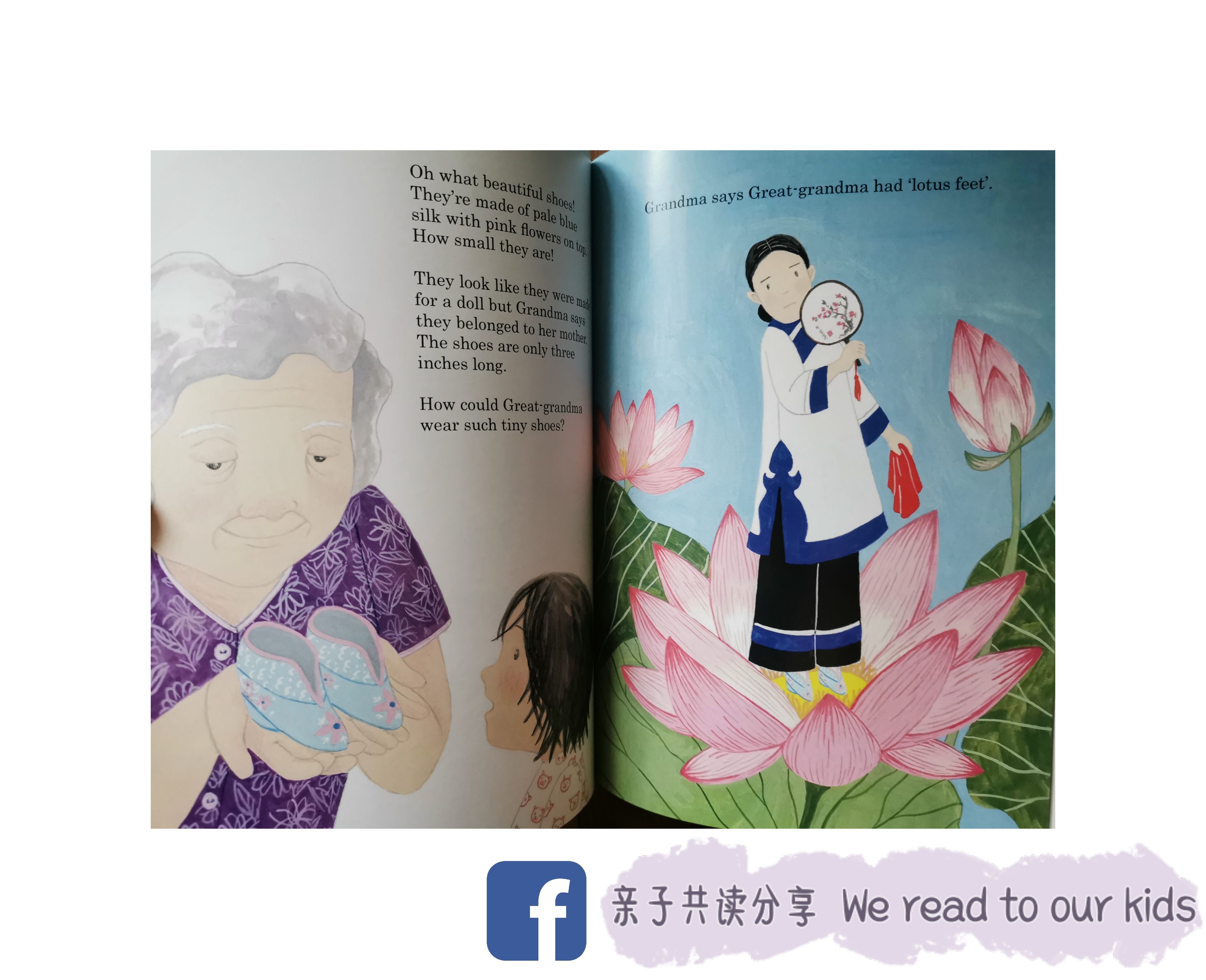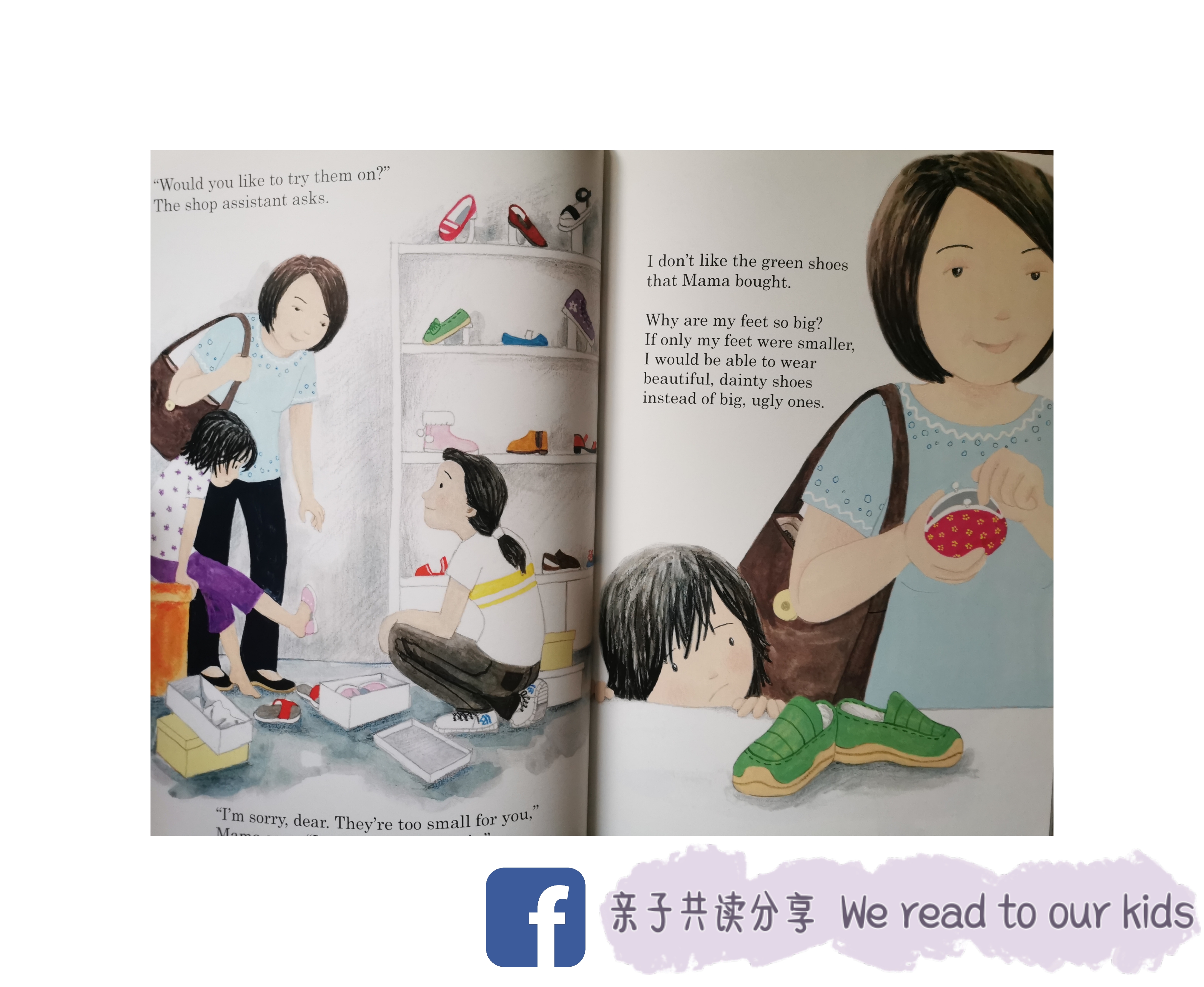 我个人还蛮喜欢这个故事的,可能因为我本身也是脚大,小时候去鞋店买鞋也是经常遇到喜欢的鞋子可是我穿不下的情况。三寸金莲这个风俗已经被抛弃很久了,新生代的人们很多未曾听闻也不出奇,我自己本身也是看纪录片才知道什么是裹小脚/三寸金莲。说真的,我观看纪录片都觉得脚被包裹成这样真的会好痛,很不舒服。希望借由这个绘本可以给孩子了解一下古时候的风俗。