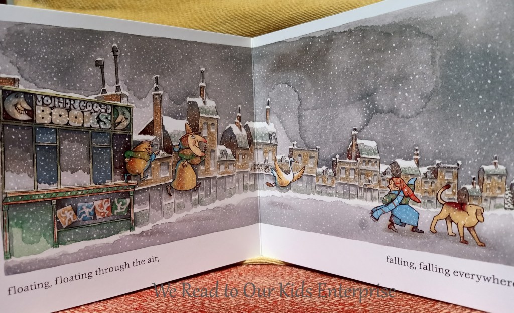 第三片雪花飘下,大人还是说,很快就会融化了。电视台和广播台也说不会下雪,可是雪花融化后立即就有新的雪花取代它。小孩的话应验了,终于下起大雪来了!大人们嘀咕着赶紧回家,但男孩和他的狗儿,甚至童书店前的童话人物展示品,都忍不住跑到户外在雪中快活地玩乐。