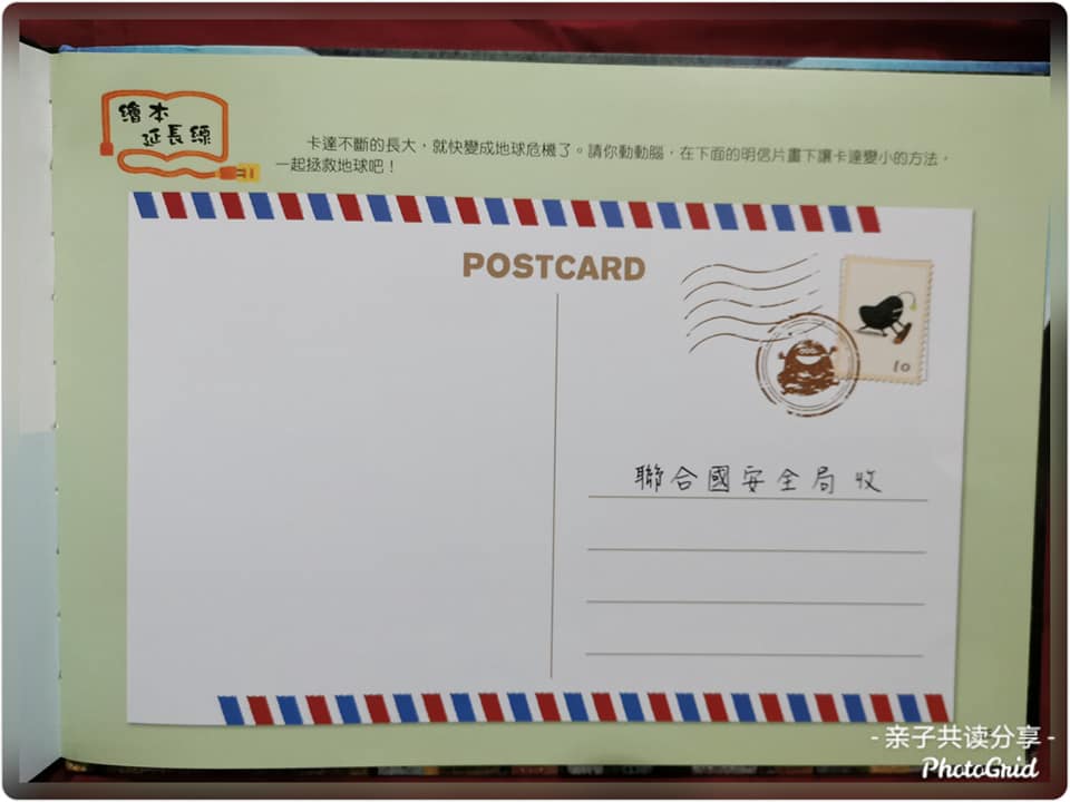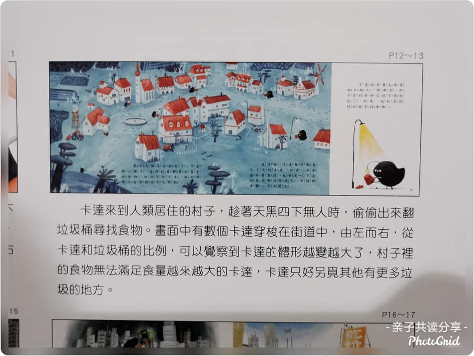 )。不知各位读者有什么好主意呢?在不断重复共读的当下,其实我也思考了很多“假如……”。假如野餐的人们好好处理垃圾才离开,卡达会演变成这样吗?假如人们不是贪方便逃避垃圾堆积的问题,卡达会变成这样吗?卡达会越变越大,是不是因为吃下去的垃圾是不能分解的垃圾,所以只能越变越大(之前住在森林它是吃松果、树枝……)?那么换去我们如今的社会,我们也需要认真看待如何处理那些垃圾,尤其不能或需要花费好多年来分解的产品。故事没有留下真正的结局,反而促使我们去思考问题。