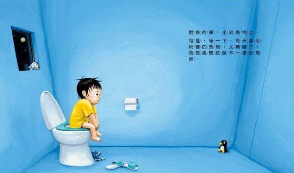 待在狭窄的厕所里上厕所展开的脑洞大开的奇幻冒险故事。作者绘画出各种不同设计的马桶,真是创新又奇特啊!再搭配上寻找每一页企鹅小狗玩偶和找出偷马桶的小偷的过程,就让亘宝看了快两个月都还很津津有味。有兴趣的读者也可以看看作者的同个系列作品(繁体)《我的飞天浴缸》或(简体)《我的百变浴缸》。