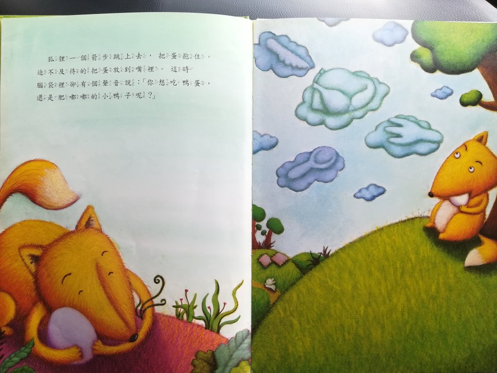 狐狸肚子饿了,找到一个大鸭蛋。当他把蛋放进嘴里,脑袋有个声音说:“你想吃鸭蛋,还是小鸭子?”