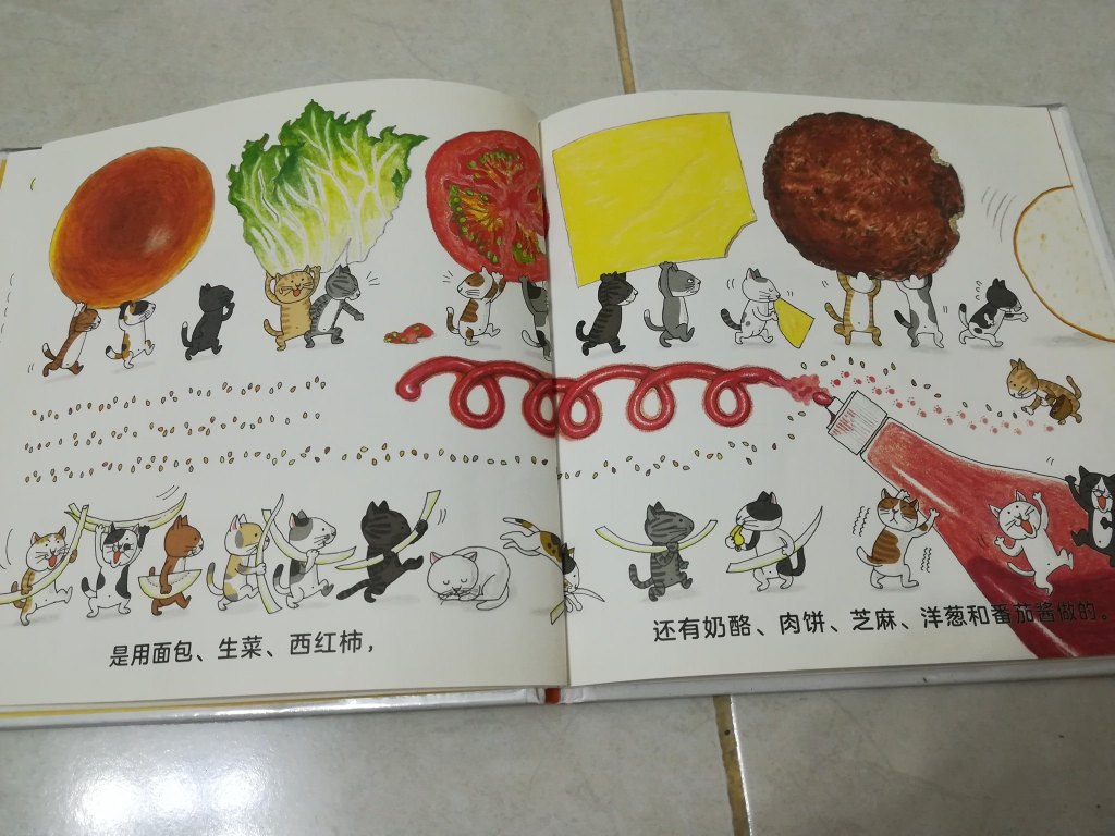 书里介绍了几样食物是由什么材料做成的。作者把每一种食物的材料都一一地画完出来。第一种所介绍的食物是饭团。饭团是用什么做的呢?小老鼠把那饭团的每一粒饭都被排列得整整齐齐。书里的动物表情都很可爱,有许多小细节可以让孩子慢慢观察。兄弟俩尤其喜欢猫咪的那页。猫咪一面搬食材,一面偷吃,孩子们一定能发现。