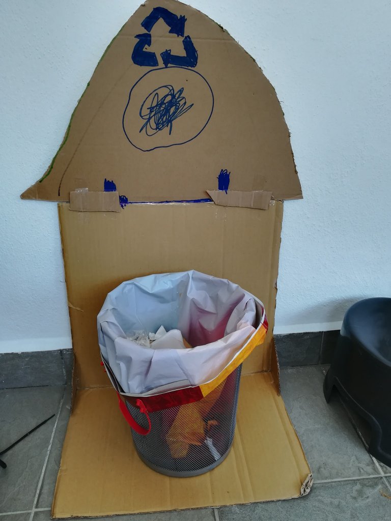 第二次与孩子共读这本书时,哥哥突然兴致勃勃地向我提议要做一个回收桶,说要做一个有屋顶的回收桶放在屋外,让大家把能回收的垃圾丢进去。好吧,我们第二天弄!(这句话有点儿敷衍打发他的意思)