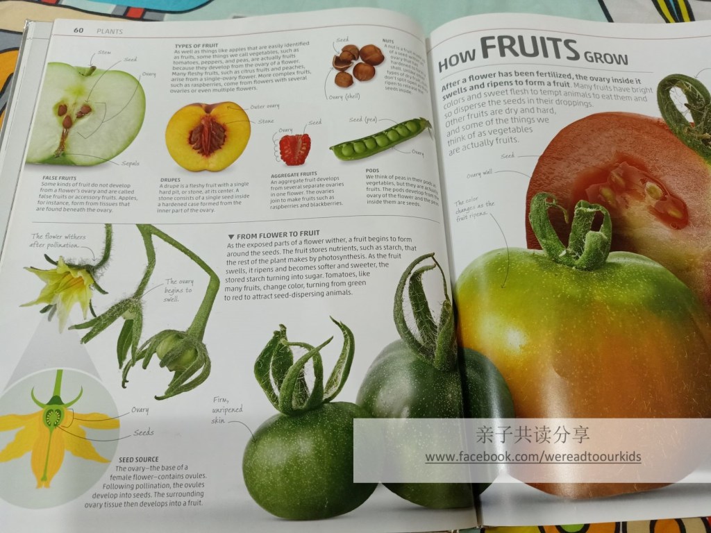 某天吃完晚餐,多多突然指着我的苹果说,“妈妈你知道吗?苹果是False Fruit,因为它不是从Ovary长出来的.” 推崇有科学根据的论说但科普知识却很匮乏的我,一脸茫然。多爸一番解释后,看我似懂非懂,还鄙视地抛下一句“中学生物学过的”。问多多哪看来的资料?他说是自己从 Explanatorium of Nature读来的。两年前还在Pink Box(蒙式英文C-V-C教学最初级)停滞不前的落后儿,现在已经能自己阅读、理解科学内容了。但语文学习不是我今天想要聊的。