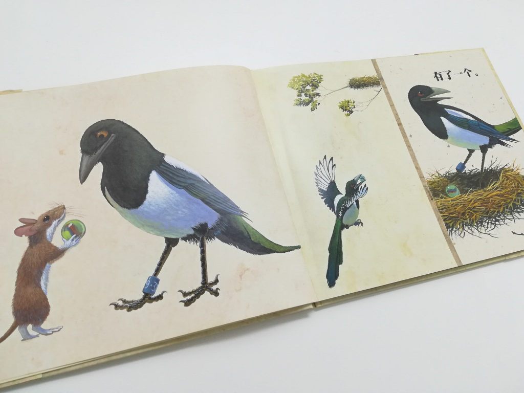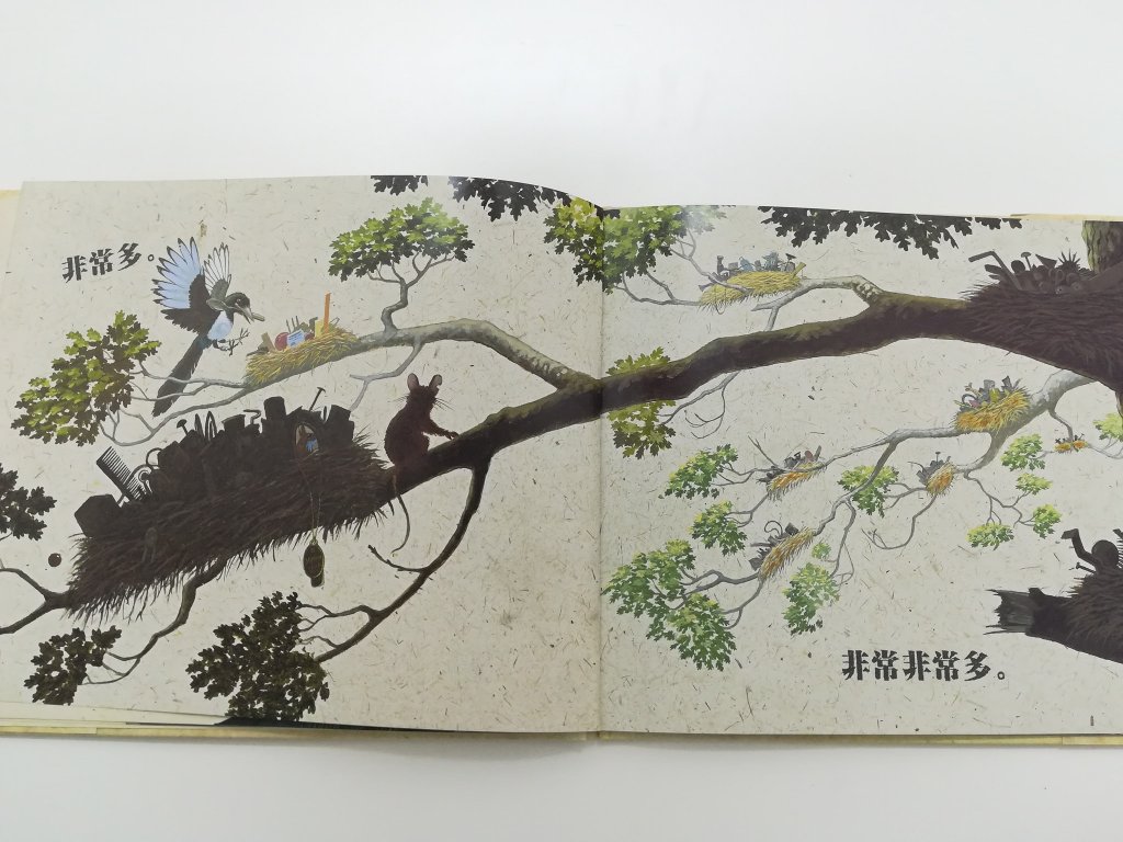 一开始,喜鹊的巢空空如也,什么也没有(喜鹊的表情是不开心的)。老鼠送了一颗玻璃弹珠给喜鹊,它变得开心了。接着,喜鹊不断地衔了许许多多的东西回巢。它越捡越开心,东西越来越多。非常多,非常非常多,多得需要很多个鸟巢才放得下这些东西(我数了,是十个鸟巢)。