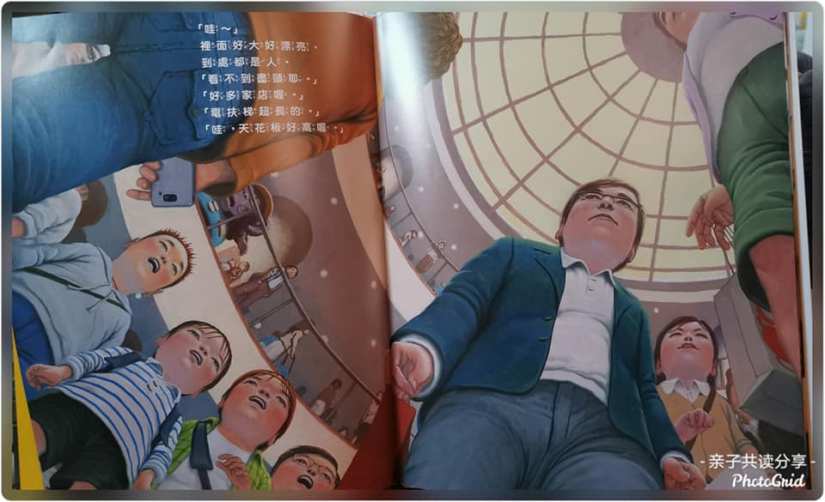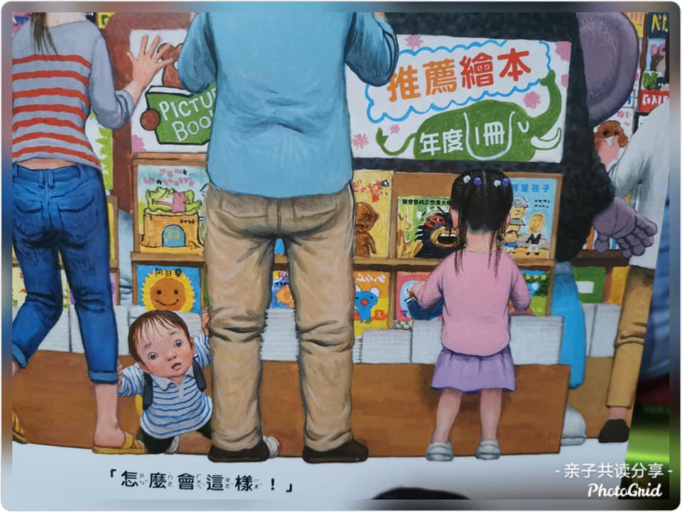 另外,亘妈很欣赏绘者的画工。尤其不同角度的展开(详看附图一)故事场景,孩子的视觉去看商场和站在高高的楼层往下俯视的角度。还有一些小细节画得好好,举例书局里摆放在书架上的绘本,你们有看到熟悉的绘本吗(请看附图二)?再来就是色调,比如弟弟止住泪水安慰自己是哥哥走丢的那一页,路过在主角周围的人们,绘者在他们脸上用的色调都是偏蓝调,给人一种冷漠的感觉。照逻辑说,如果你看到一个孩子独自走还要大叫“哥哥,你在哪里?”,通常我们都能知道这个孩子和家人走失了。在哥哥找到弟弟的那一页,人群换成红色。而当他们抱在一起的时候,人群的色调换成温馨的暖黄色。