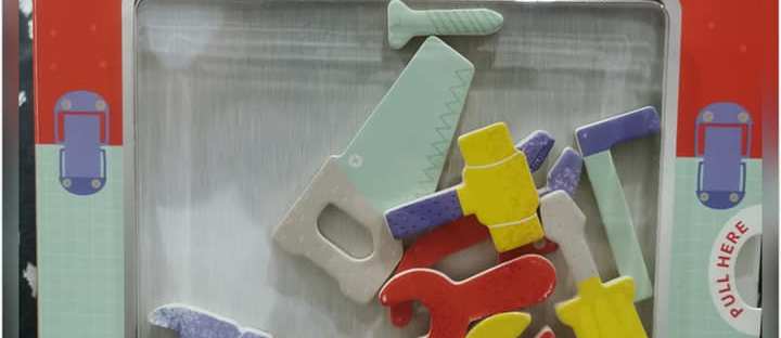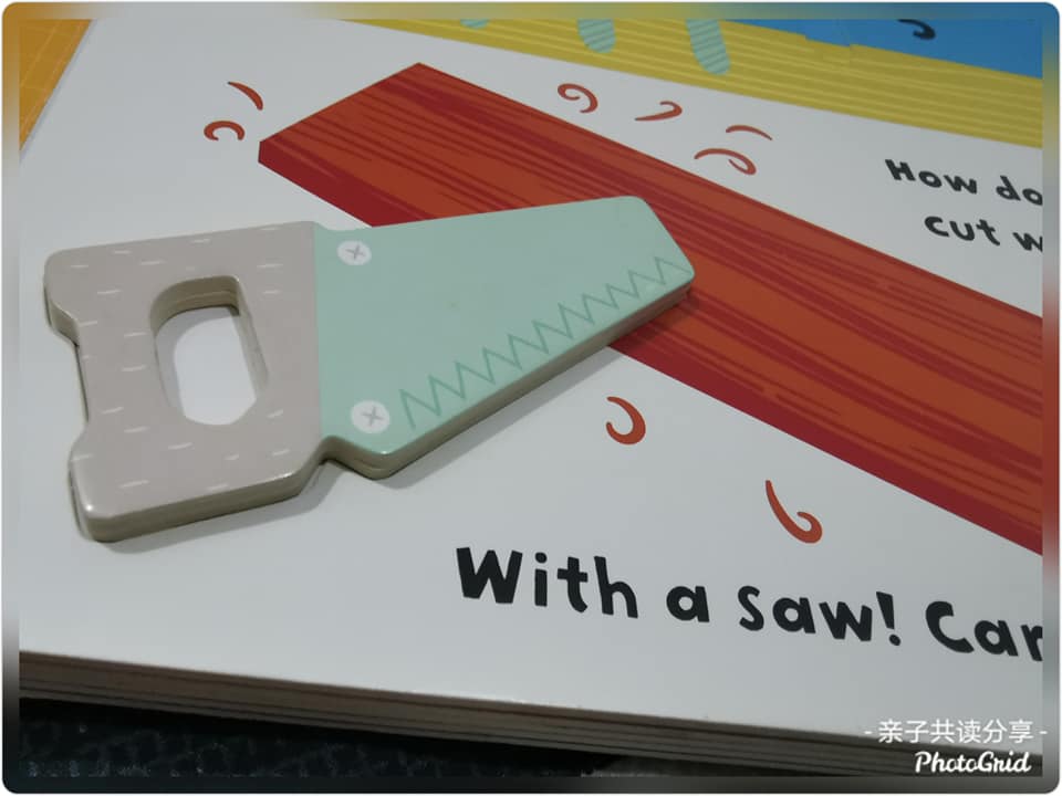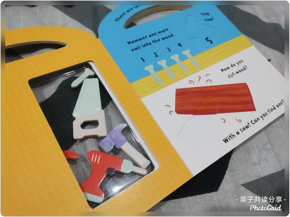 厚实的小工具搭配着故事里的指令,亘宝玩得不亦乐乎!小工具虽小但是做出的厚度让手感很好抓握。故事里一时要锯木,一时要锁紧螺丝、敲铁钉……亘宝需要找出正确的工具放入空位置,如果拿错了就会放不进去。亘宝也很喜欢最后一页的收纳,全部工具归位后,她也会说”Tidy!” 现在亘妈和亘宝都掌握了工具名称(当妈的也在一起学习
