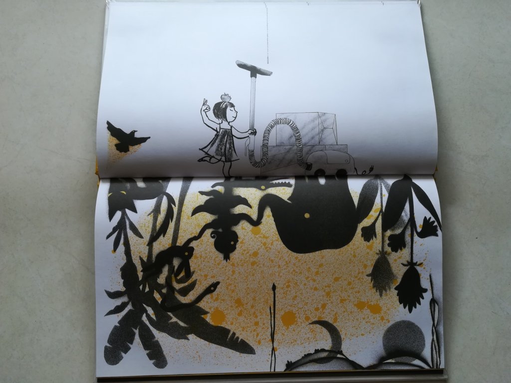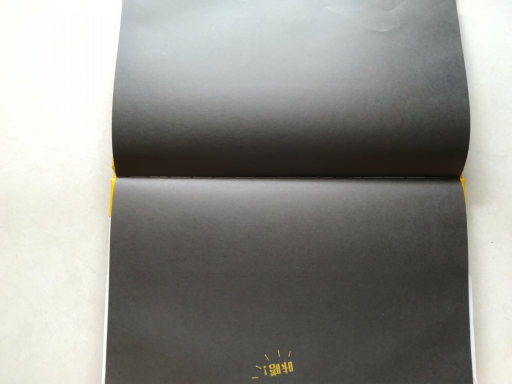 “吃完饭了!”这四个字打破了这美好的情景。画面立刻变回那储藏室的原样,不过,那些东西都变得乱七八糟了。“咔嗒”关灯了,一片漆黑。以为这就结束了,再翻下去,有意想不到的结尾。影子的那页出现黄色的“咔嗒”,你们猜到接下来那页发生什么事吗?