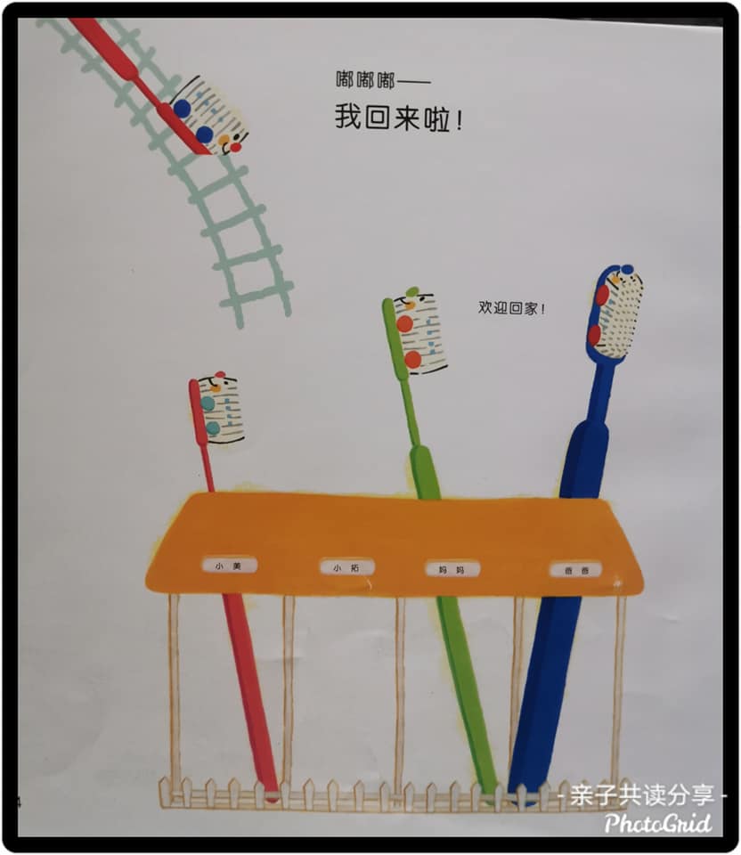 后来的后来~猪宝刷牙不想张口的时候我就模仿刷牙小火车“刷刷刷”和“嘟嘟嘟”,现在他都愿意张口刷牙,跟小拓一样好配合呢!谢谢这本绘本把刷牙这件事描述得那么有趣好玩!而亘宝呢,她很喜欢最后一页的牙刷全家福,因为像极了我们家的牙刷架,我们家也是有爸爸、妈妈和亘宝的专属牙刷架哦。