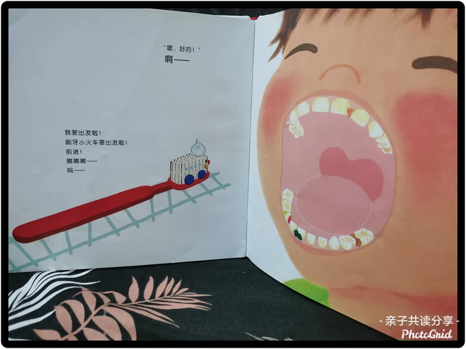 故事的蝴蝶页介绍了牙齿的分布和名称,科普了一点点关于牙齿方面的知识。而造型可爱的刷牙小火车一登场,故事主角小拓原本是不喜欢刷牙的孩子,后来也配合着刷牙小火车张开嘴巴让它把牙齿刷干净。随着小火车“刷刷刷”和“嘟嘟嘟”,孩子们可喜欢了,亘宝会跟着模仿,猪宝跟着开口说“啊~”。
