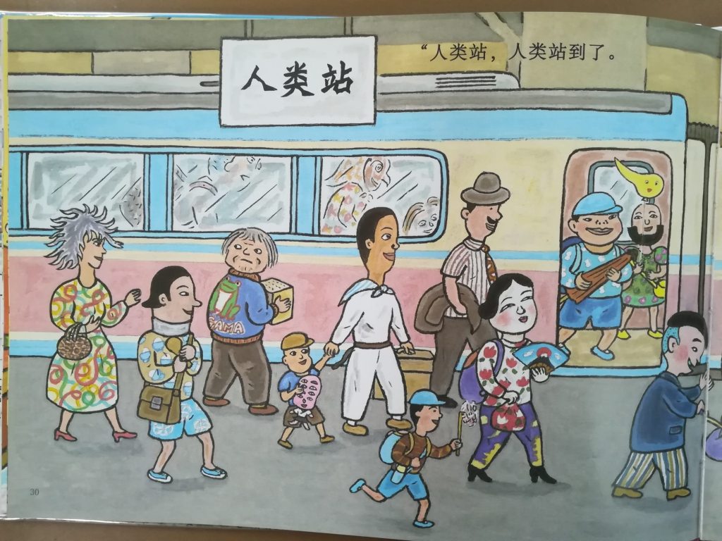 这本书真是考大家的眼力。来,大家一起找找看,在妖怪站和人类站都有一个戴着蓝色鸭舌帽和手拿着纸风车的小男孩。他们是同一个人变的。