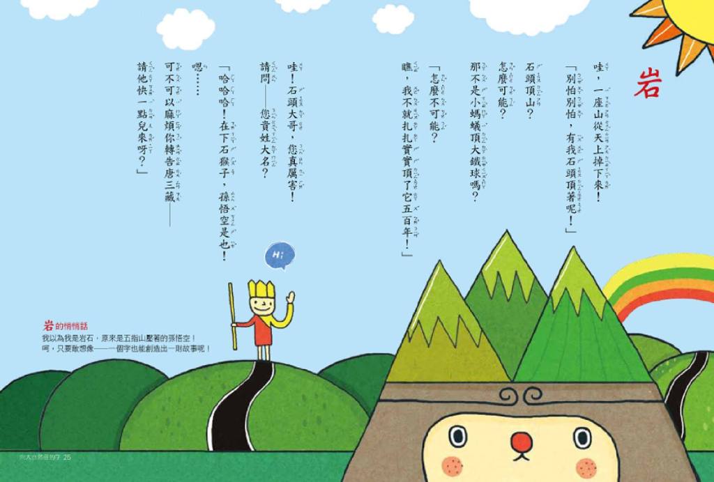 此外,这是一本童诗集。首首字的小诗并没有因汉字知识而流于说教,巧妙结合汉字特点之余,充分表现出童诗的童趣、节奏、创意,甚至哲思。比如“岩”,看着这个字,你联想到什么?作者这样来写: