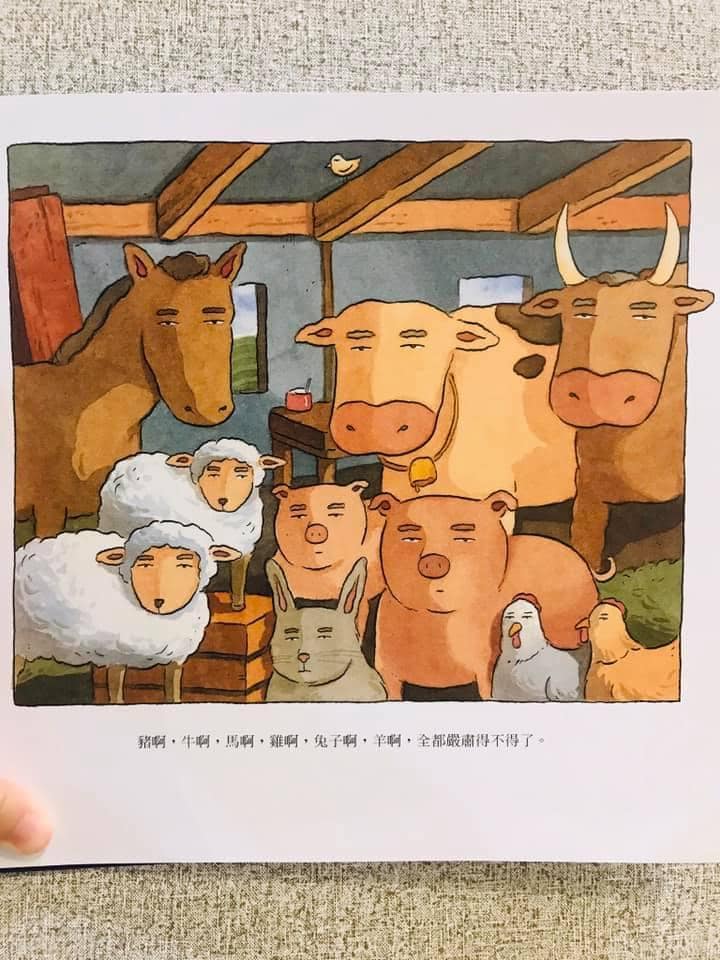 3. 故事非常简单,农场主人很严肃,所以农场的动物想要逗主人笑。第一个出场的是母牛,她开始学公鸡叫。