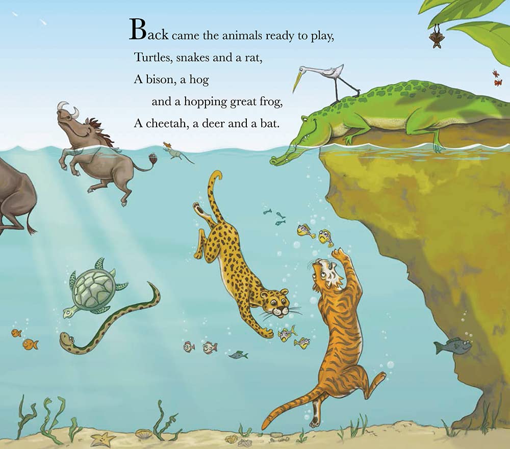 这本绘本虽说是亘宝自己在图书馆挑的,可能是好书太多了,她竟然很嫌弃要共读这本书。有一天,我就跟她说不妨换一换念别的书,妈妈我为了要吸引她就卖力共读,念得特别投入就对了!结果亘宝最喜欢我模仿鳄鱼跺脚大喊把其他动物赶走的那几句:”Get out of my river!!”,”it’s only meant for ME!”….