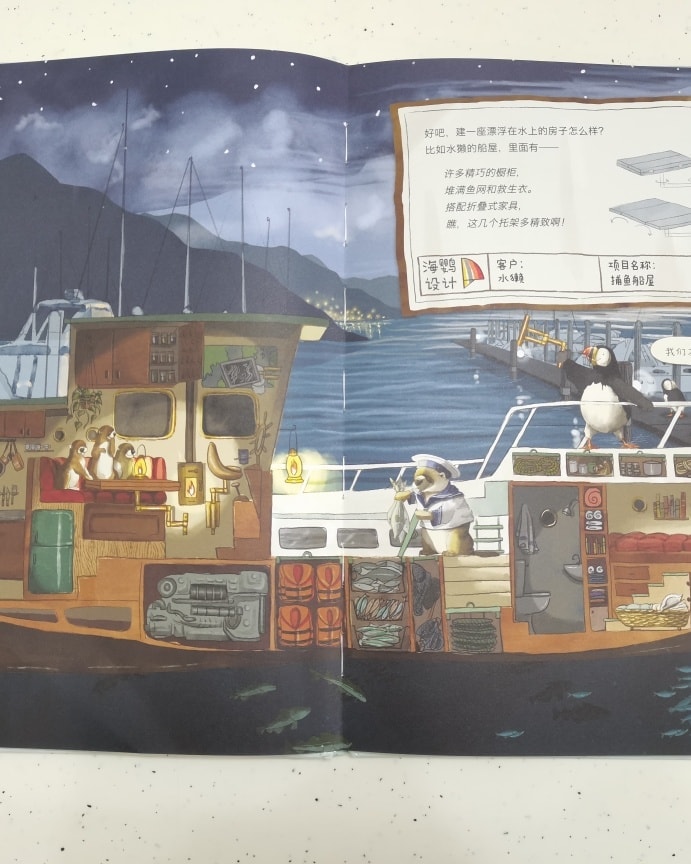 面包师鸭嘴兽的家有个大烤箱,还有许多精巧的橱柜,让他放面粉、食盐和酵母,方便极了。水獭的船屋里面有许多精巧的橱柜,可以把捕鱼网、救生衣收藏在里面。搭配折叠式的家具,船屋虽小,但五脏俱全。接下来,还有侦探犬的秘密书房、猪先生的拖车式房子、画家白鹅的工作室、飞行员驼鹿的树屋……每一间家都非常有特色,最重要的是,全部都有许多精巧的橱柜,还有一些善用空间的折叠式家具,让我看了都心动。
