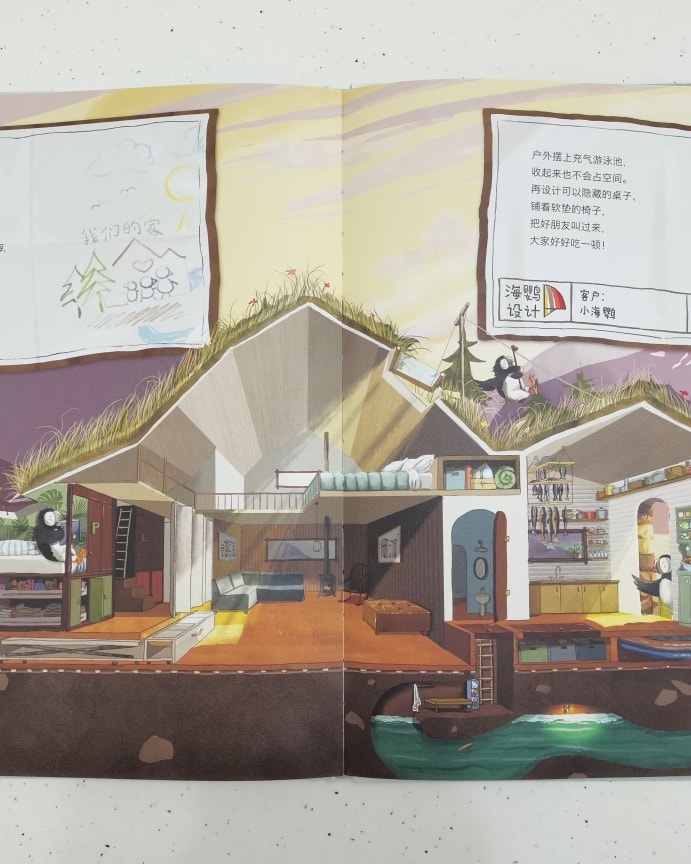 小海鹦都不喜欢这些动物的家。最后,海鹦为他们在海边建造了一间独一无二的家。里面有许多精巧的橱柜、折叠式家具、一条连通到大海的地道……多巧妙的设计啊!原来,建筑师海鹦是小海鹦的妈妈,后知后觉的我看到最后才明白。![]()