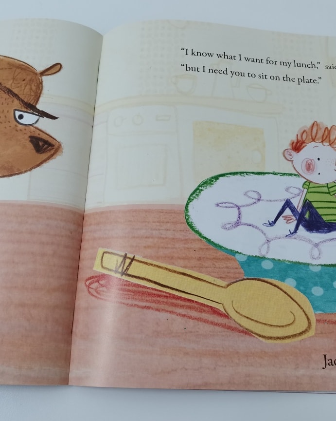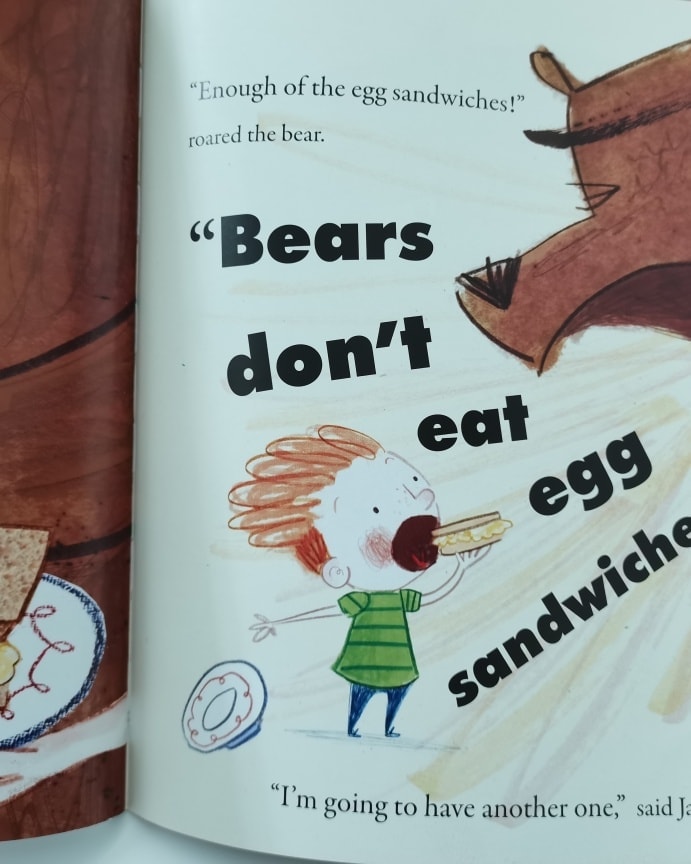 一天,小男孩正在准备三明治午餐。门外有人敲门,是一只大熊。大熊的肚子饿了。小男孩一直问大熊要不要吃三明治,而大熊一直重复说:“Bears don’t eat egg sandwiches.” 大熊让小男孩准备一个大碟子、一个大汤匙,最后还叫小男孩坐进大碟子里。