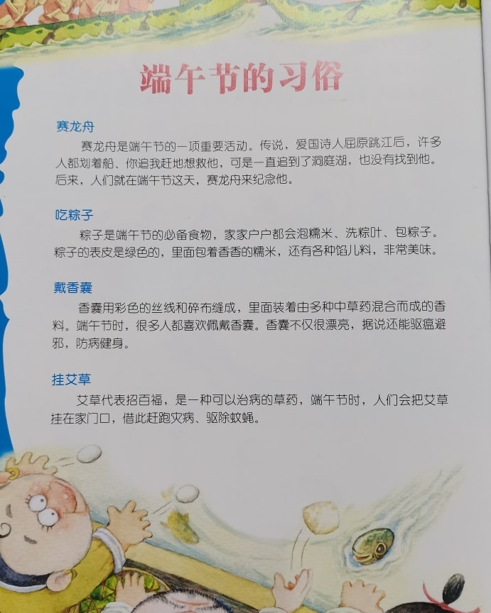 这本书的内容讲述了端午节的由来。屈原和楚怀王的关系被奸臣挑拨离间,过后还被驱逐流放。楚怀王死在秦国,楚襄王昏庸无道,最后秦军攻下了都城,楚国灭亡。流放在外的屈原知道这些消息后,伤心欲绝,在五月初五这一天跳进汩罗江自尽了。