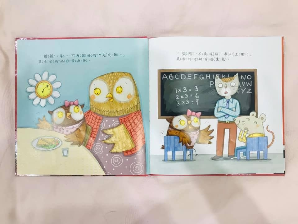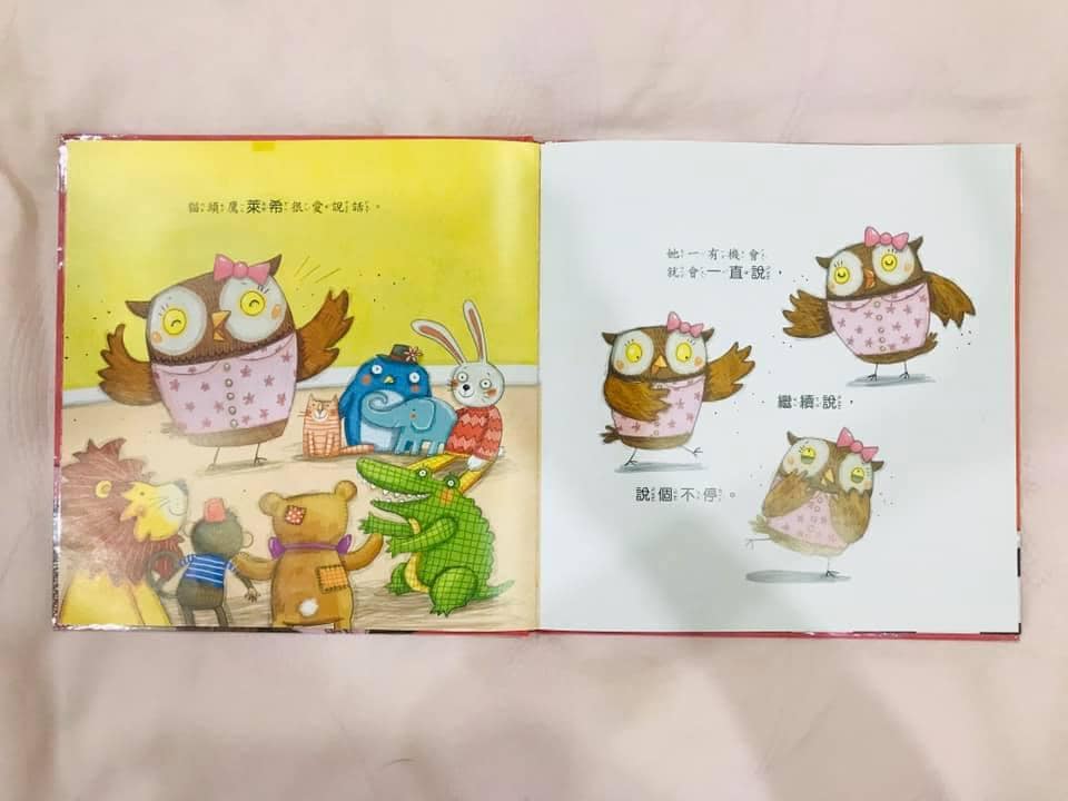 故事里的小猫头鹰也总是爱说个不停,直到有一天因为嗓子不舒服说不出话了,被迫“不能说话”,也被迫要“听别人说话”,却意外地发现很多平时因为顾着说话,而没有机会去做、去体验的乐趣和感受,从此小猫头鹰不但爱说话,也变得愿意聆听了。